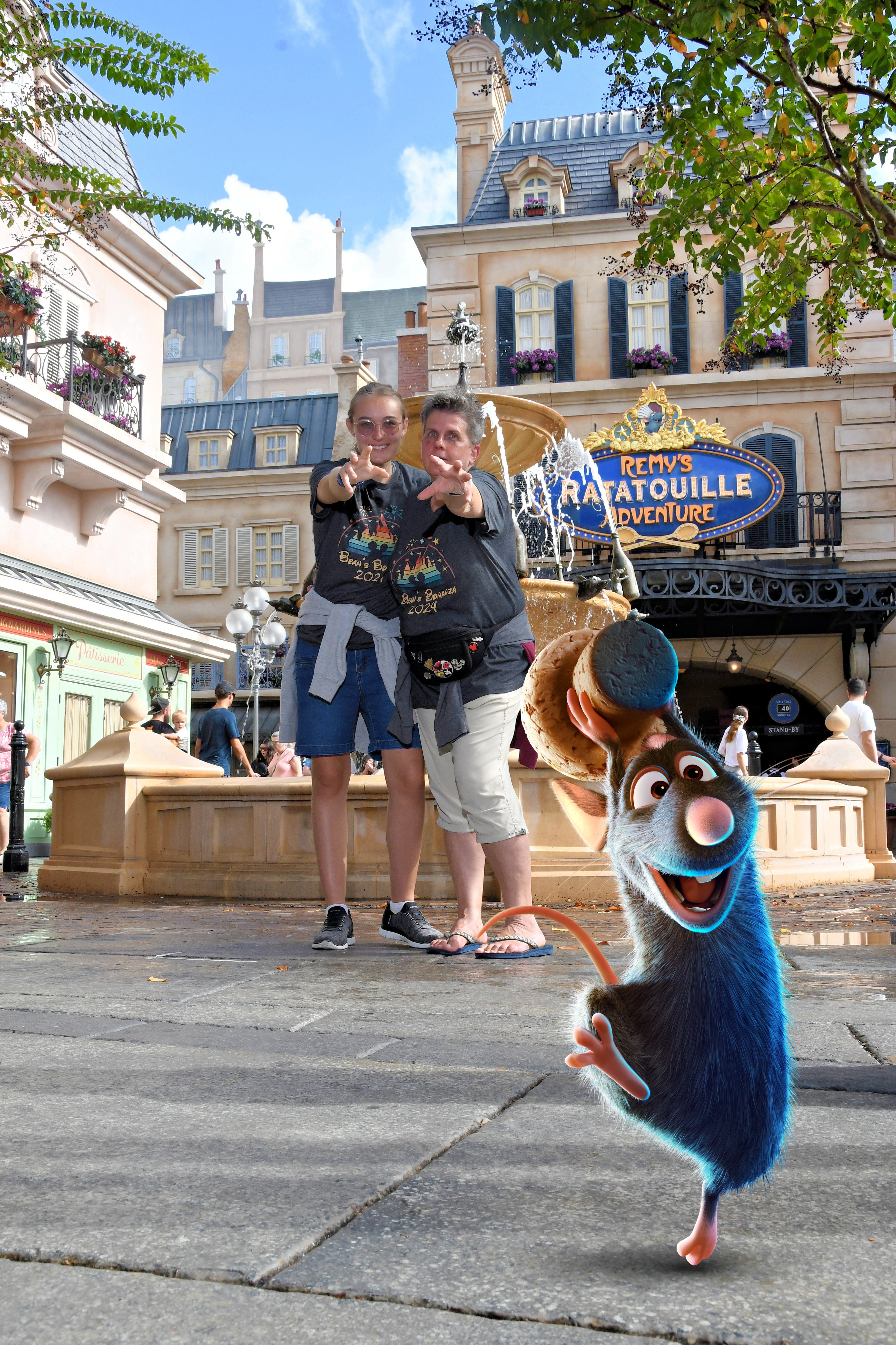 We were doing Emile’s Fromage Montage (because that’s just fun), so we got the Raclette, which was tastier than I had expected to find outside of actual Switzerland. After we were full again, and quite tired, we decided to go ahead and wait in line for Remi. It was about a 40 minute wait. A bit hot outside, but we definitely needed a slowdown break. Literally about 3 seconds after we get to the indoor section of the line, there is great exclaiming and pointing outside - the skies have opened up and a huge sheet of rain is pounding down. Whew! After we ride the photo pass photographer had a very short line, so we stop and get some cute pictures.