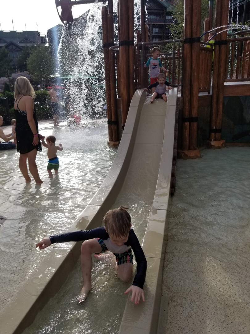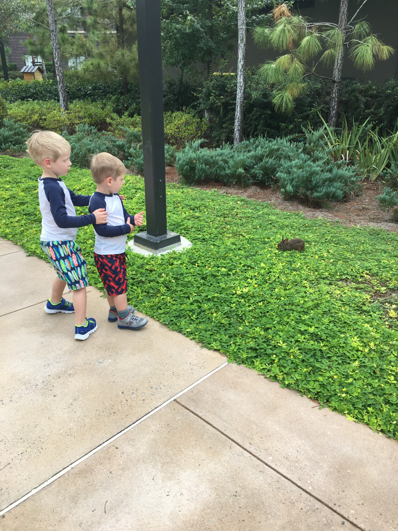 2:45PM Boat to WL, downtime in room. I thought that after the late night, and long morning the boys would take a nap. WRONG! When we got back to the room they got a second wind. They were bouncing off the walls with energy. It was frustrating, because I could foresee this happening every day on our trip. Turns out I was right. 8 days without naps… Finally, we gave up trying to rest around 4:30 and we took the kids down to the splash pad to play/swim for about an hour. Then we explored the resort a little bit. WL is so beautiful! PP and the boys found a “cozy spot” that they went to for a little bit each morning/afternoon while we were trying to get things packed and ready for the park. I’m sure PP will cherish that memory for many years.
