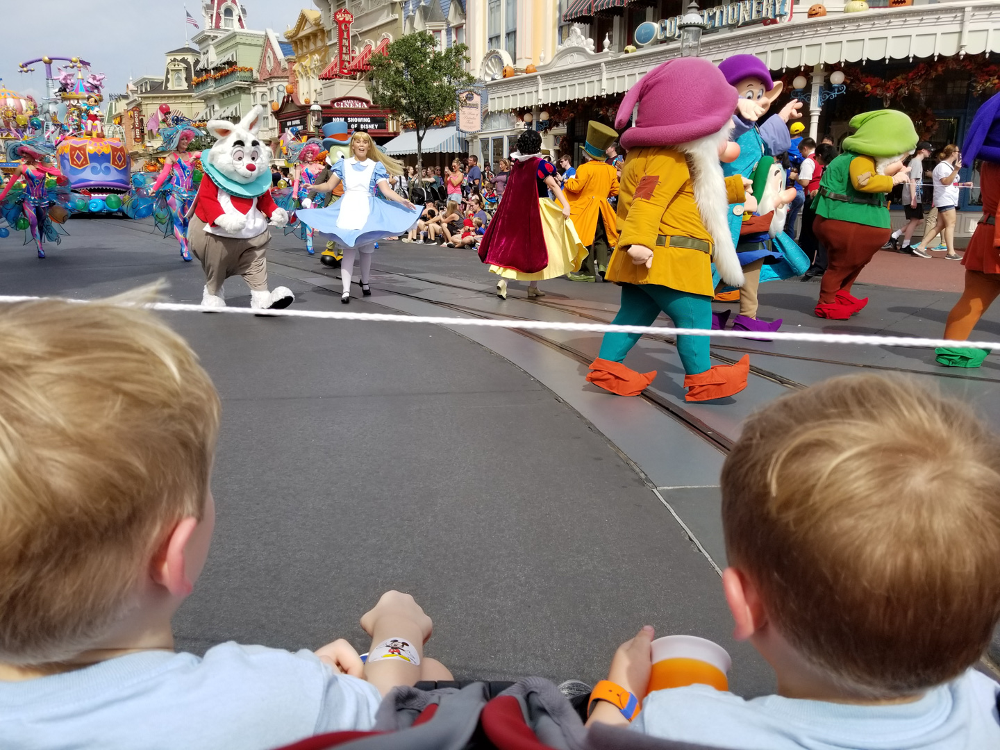 1:40PM Used FP+ to meet Tinkerbell at Town Square Theater. The boys were more interested in her than Ariel, so maybe it was the mermaid form that threw them off earlier. We had a great interaction, and this was one of my top 5 character meets. After this we headed outside to the VIP area for the parade