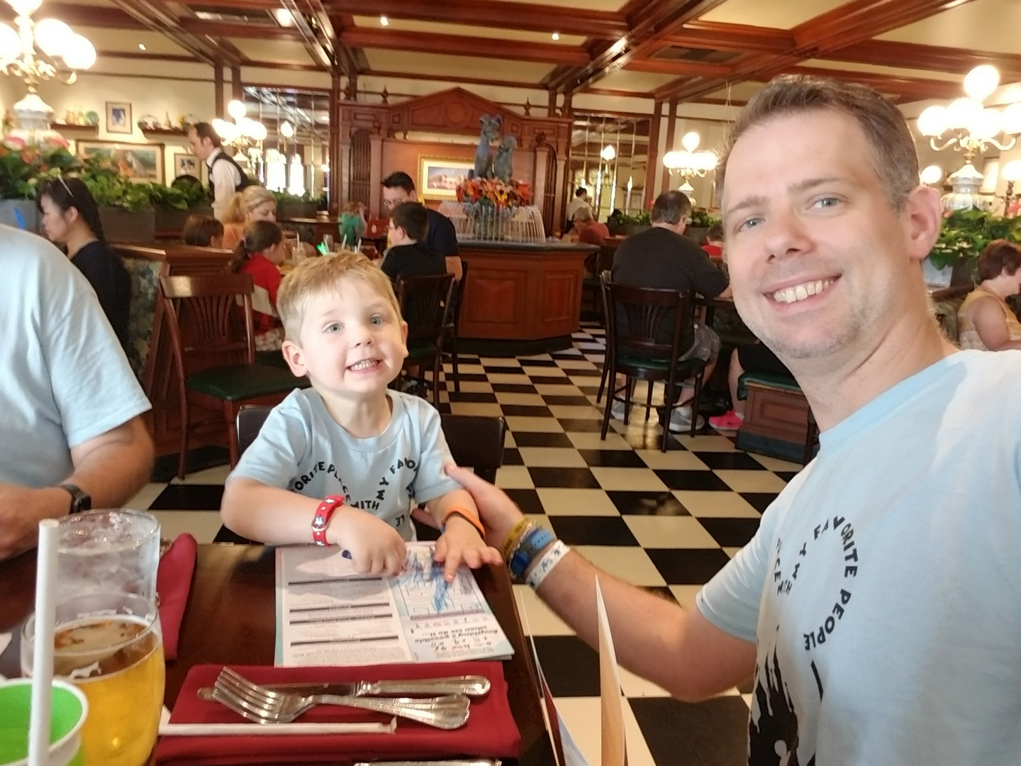 12:10PM ADR at Tony’s Town Square Restaurant with parade VIP package. They wouldn’t seat us until everyone was present, which was annoying because DW had taken DS3 to the bathroom, and wasn’t back for 10 minutes. The bathroom was literally 10 feet from the host stand. I think this policy is ridiculous. It wasn’t a big deal though, because we had plenty of time to eat before the parade at 2. While waiting, I got a DAS return time to meet Tinkerbell next door. We had a great lunch. All the food was delicious, and the plates were enormous. We could easily have shared meals. Cannoli for dessert, my favorite. Allergen menu: full printed version provided at table