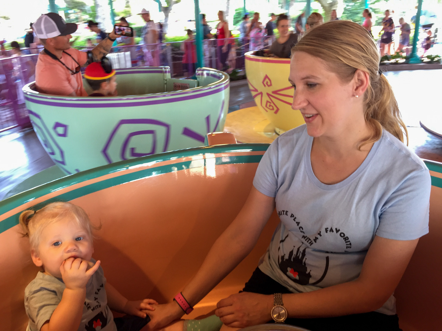 11:10AM We had a reservation at 11:30 at Harmony Barber Shop to get DD1’s first haircut, but DW decided she wasn’t ready to do it yet. I thought it would be unique and fun, and the certificate they give you would make a nice keepsake. But this was not a battle I wanted to fight and agreed to let it go ( TP adjustment #9 ). So instead we rode Mad Tea Party and Prince Charming Carousel (postponed from night before). Both standby with short waits, maybe 10 minutes each . Afterwards, we walked towards Main Street, and watched the MousekeDance It Street Party on the way, around 11:45ish.