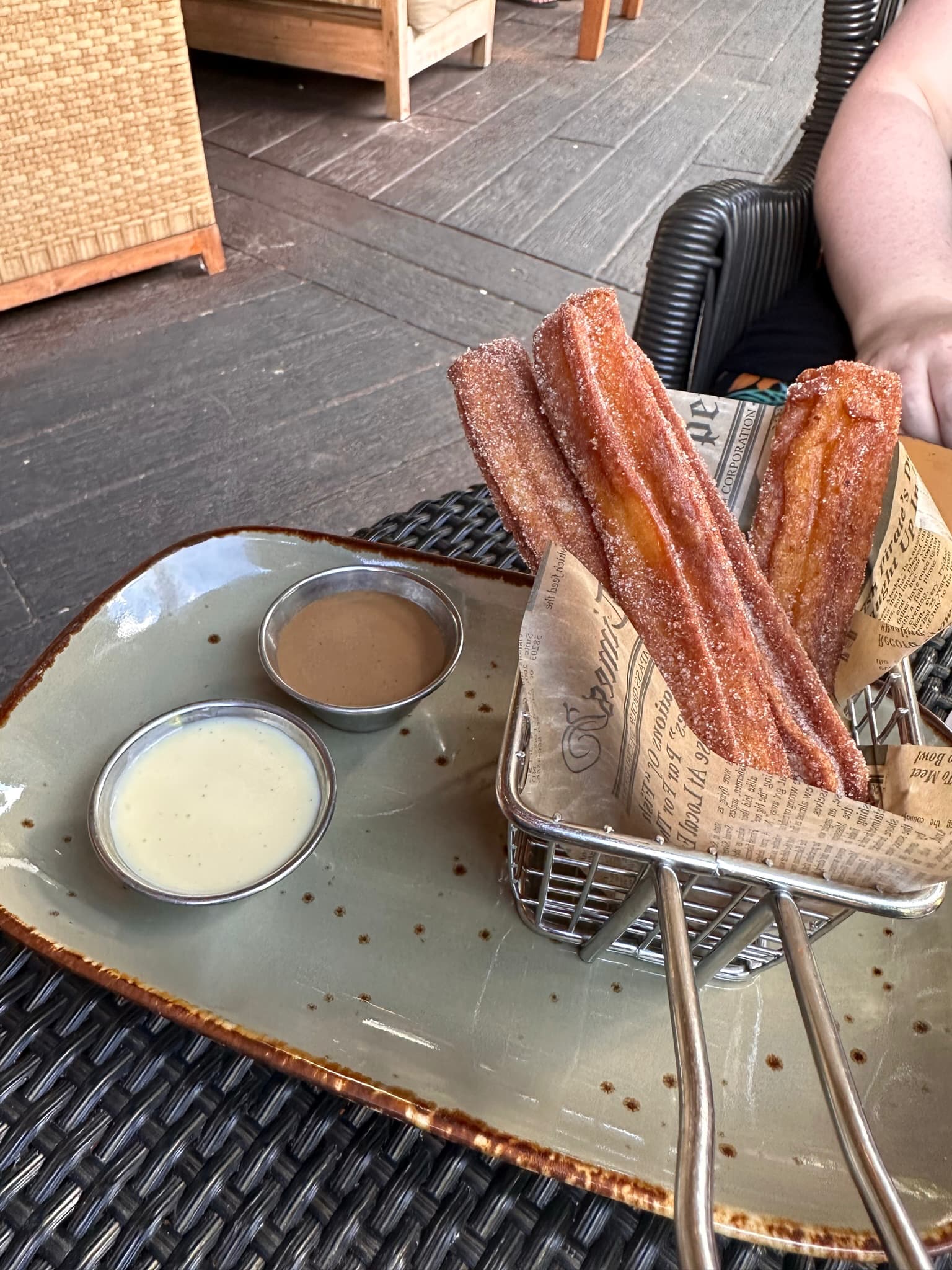 Sure enough, Nomad called us 55 minutes later, and there was a some good food to be had! We had the Gobi Manchurian and the sliders, with churros for dessert. This was a idilic setting, outside but cool and we were fed well.