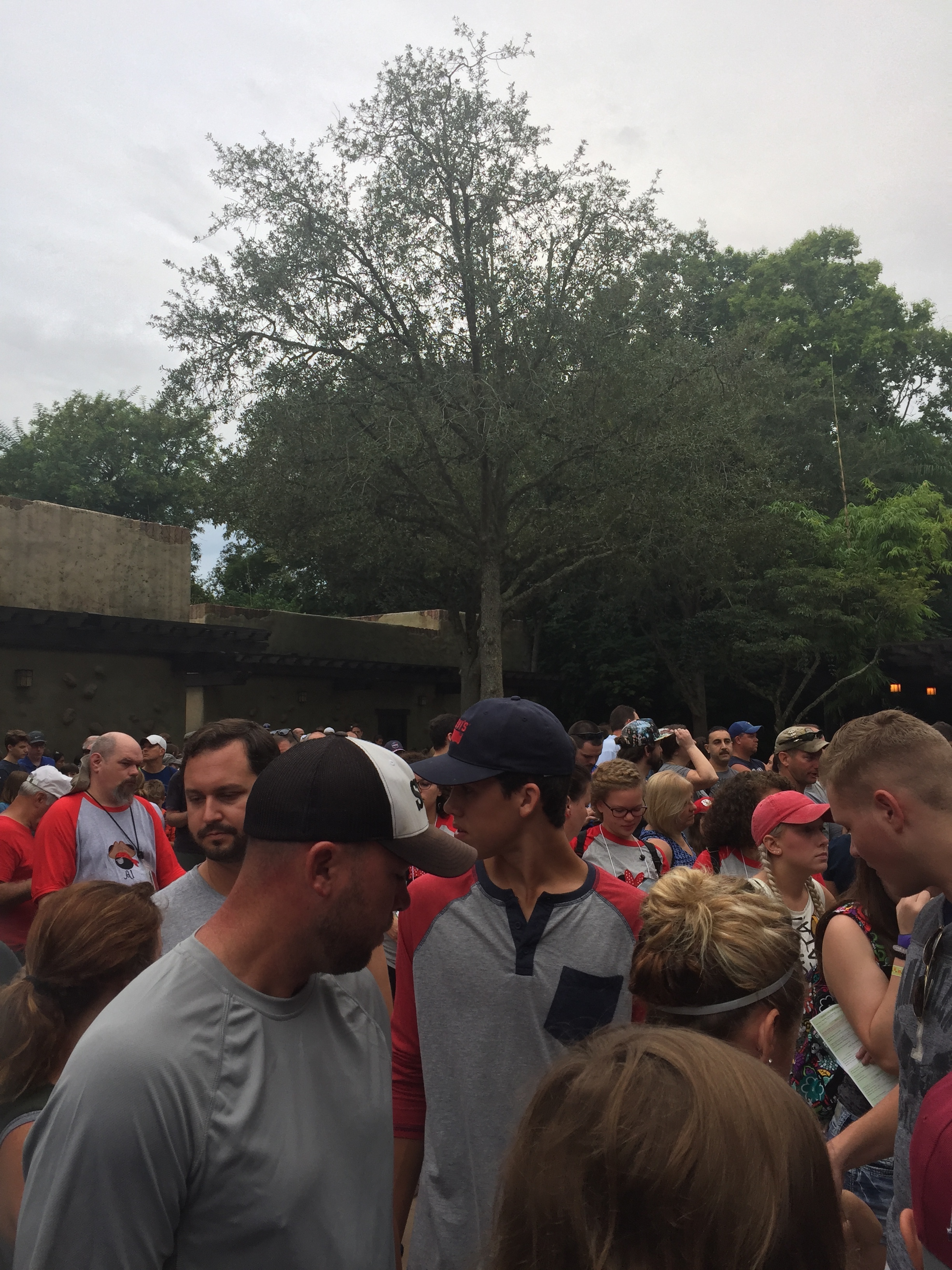 This is the line behind me on the bridge leading into Pandora at 8:30 (still waiting to be let into the area)