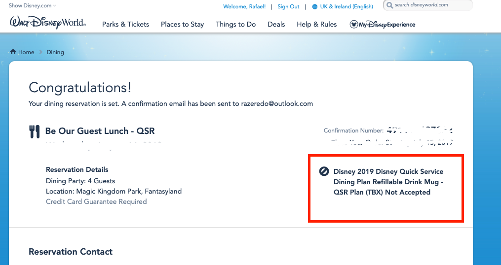 I just made a reservation for launch at Be Our Guest, to use one of our QS Dining Plan credits but in the process of I saw this message regarding the Dining Plan:
