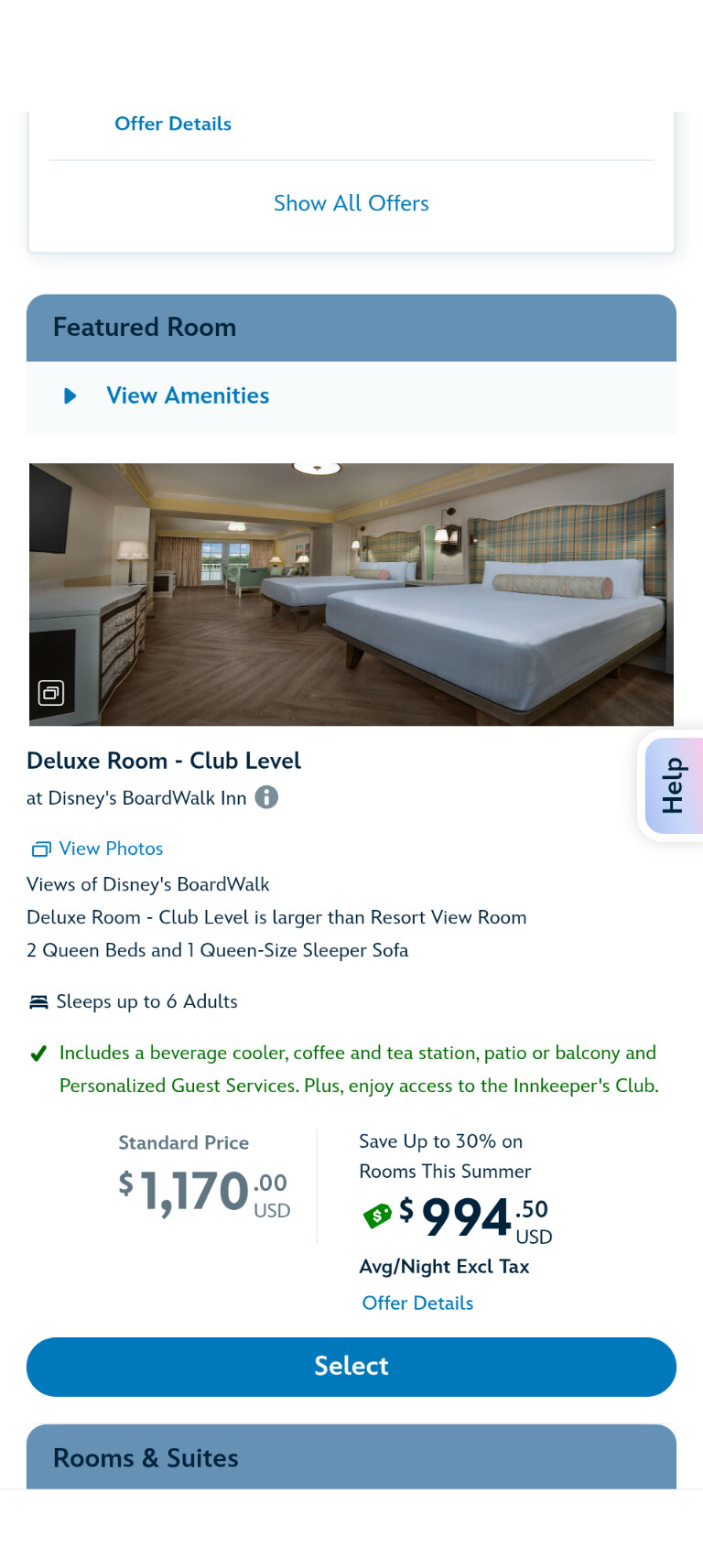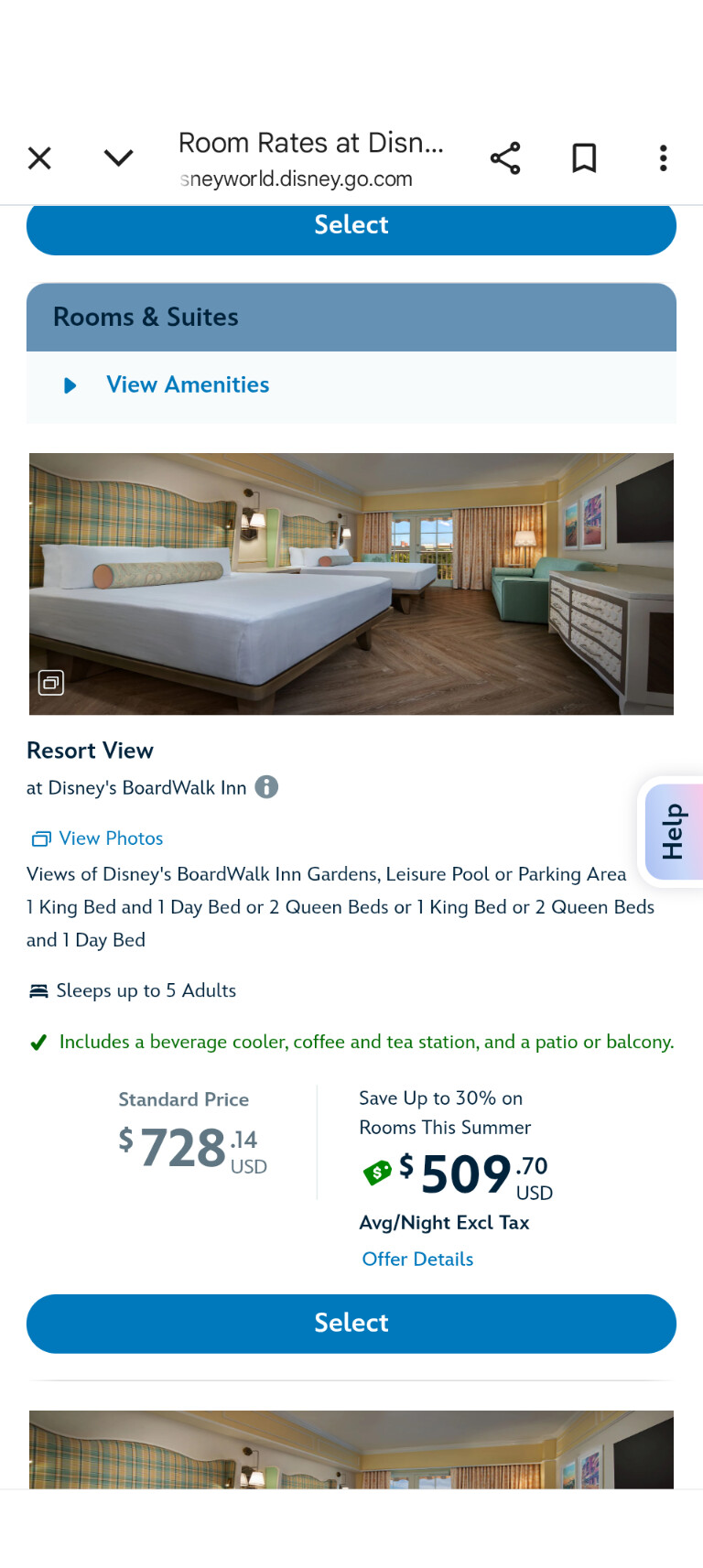 Manually looking through room finder at all “two queen beds, resort view” room type: