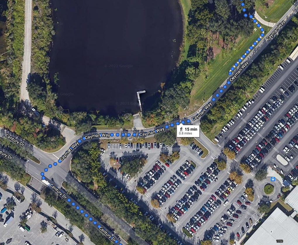 There is no walking path on Century Drive or Cayman Way. I would not recommend trying.