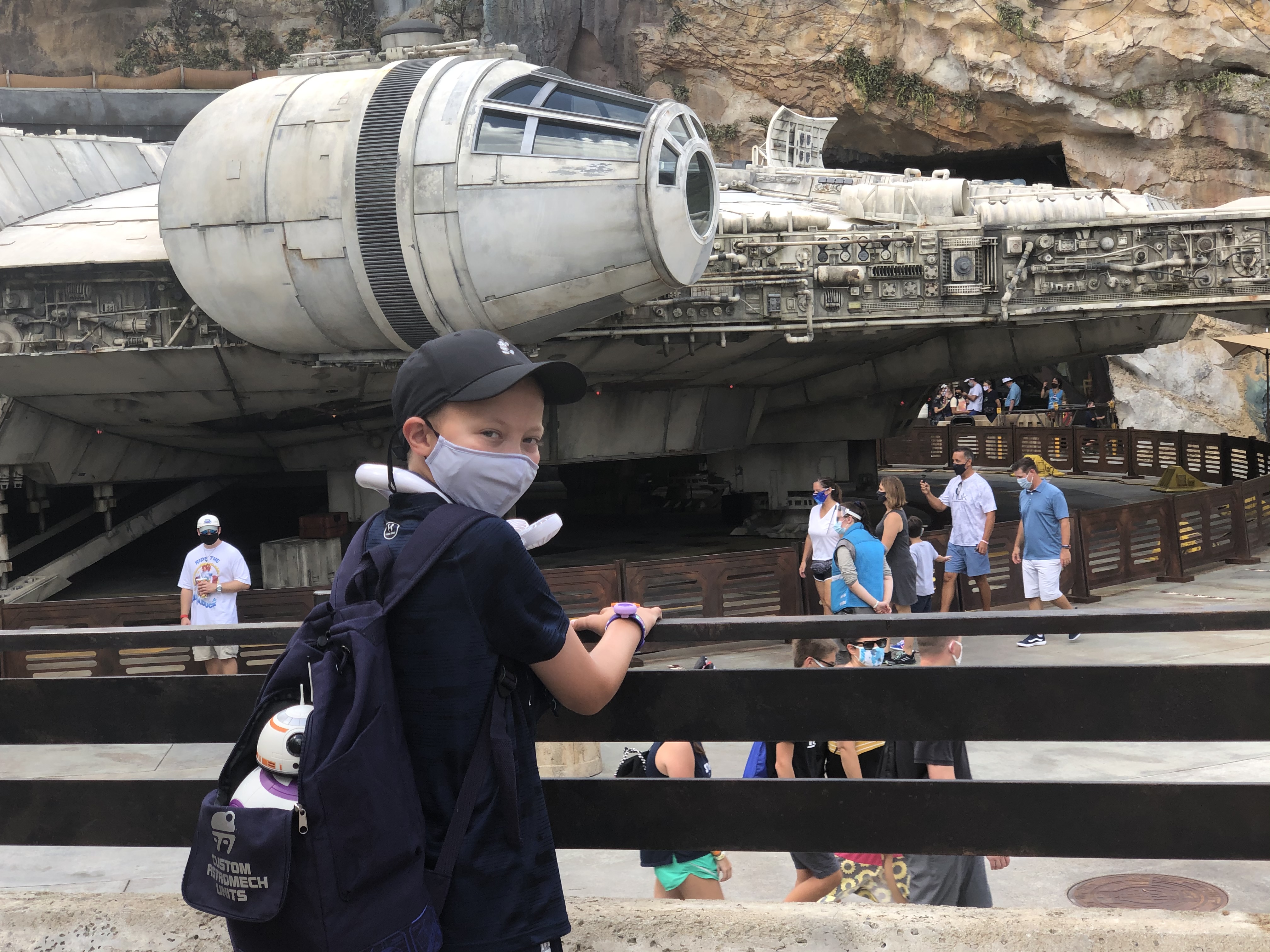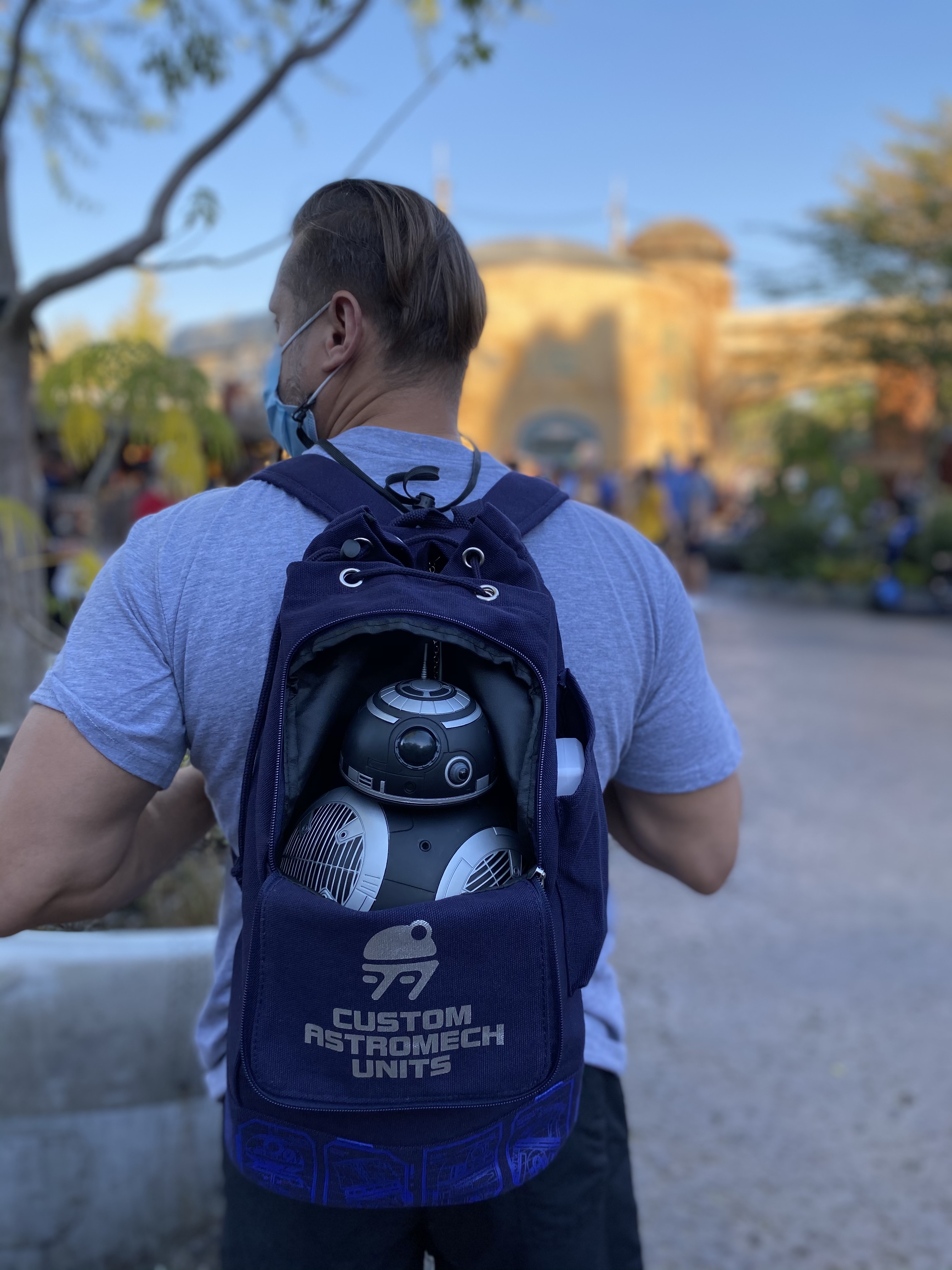 My husband and I built a Droid in December 2020 and we carried it in the purchasable backpack for the rest of the day. He wore it and we played with it while waiting in line the rest of the day. It’s not heavy and it fairly small. I suppose the size is relative depending on how old your son is. Our park backpack that we stock with sunglasses, sanitizer, water, etc was larger than the Droid backpack, so we were able to take it on rides without issue, just like our backpack. Most rides have a pouch or room at your feet to place a bag.