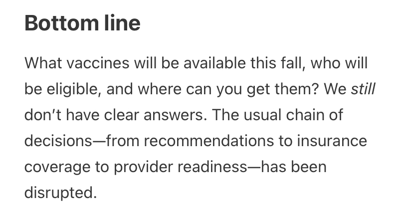 Anyone want to weigh in more about the fall vaccines? I am so, so confused, and Iām trying to keep up to date. Iāve asked the drs at my teensā recent physicals and their info is way out of date, according to the news. They think I can just go to immunizations at the base hospital (these are military drs) and ask for it. THey seemed not to know about the stuff in the news about having to go to your dr first. I was trying to preemptively get letters for my kids saying they should have the vaccine when it comes out.