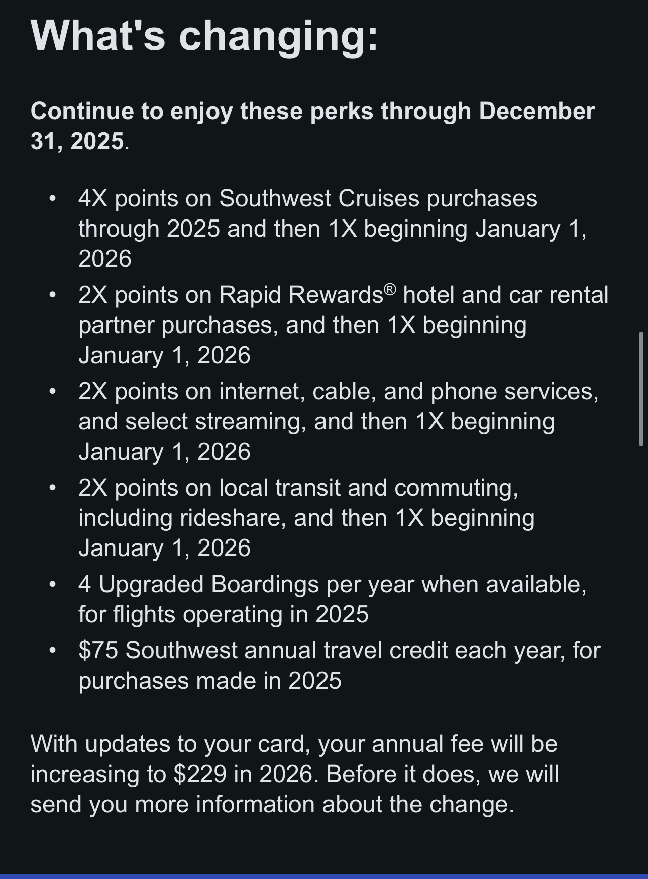 Also, looks like the Performance biz loses free Wifi credits at the end of the year - I know SW was testing free wifi earlier in the year, so guess maybe that can happen. (But, I’d be surprised.)