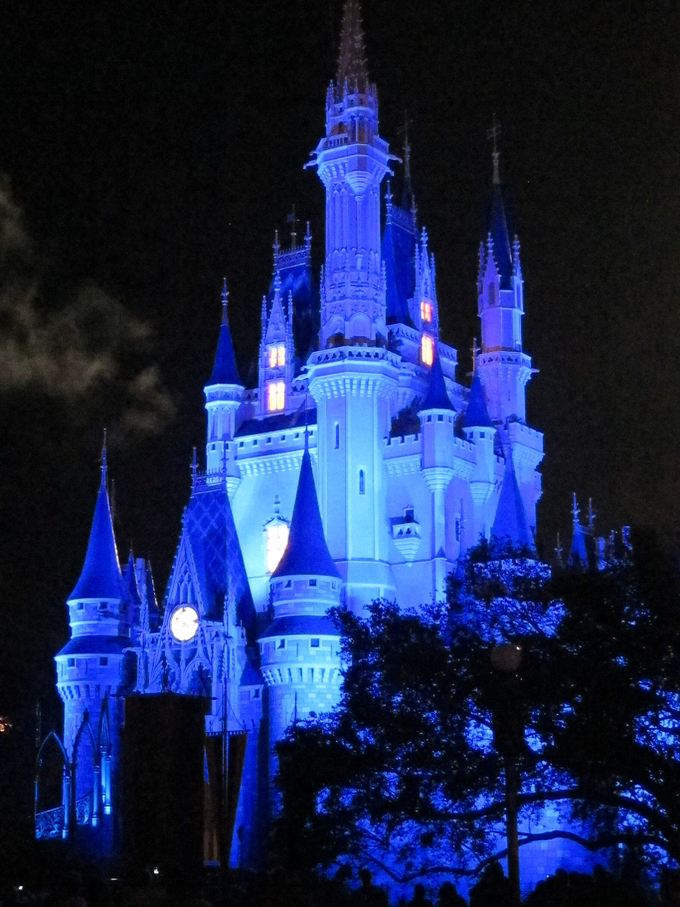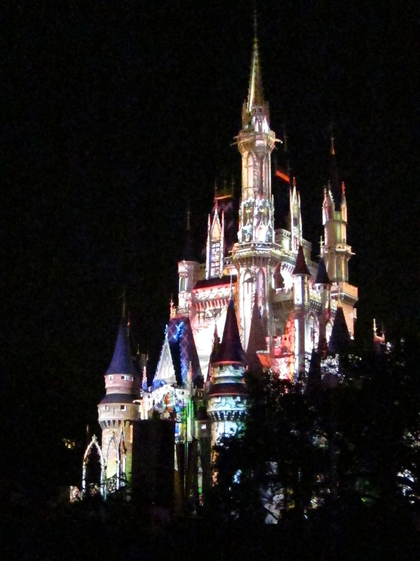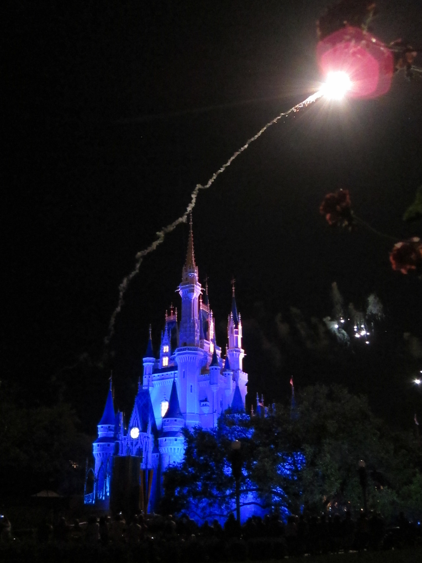 I took that while seated. If we had been at the table to the right or left of ours, the trees would have blocked the lower part of the castle a bit. The fireworks were sometimes centered around the castle, but mostly off to the right. But, we didnât know where they SHOULD be so that was fine with us! Rarely, the very most uppermost part of the fireworks display was cut off, but I think I noticed that one time, maybe.