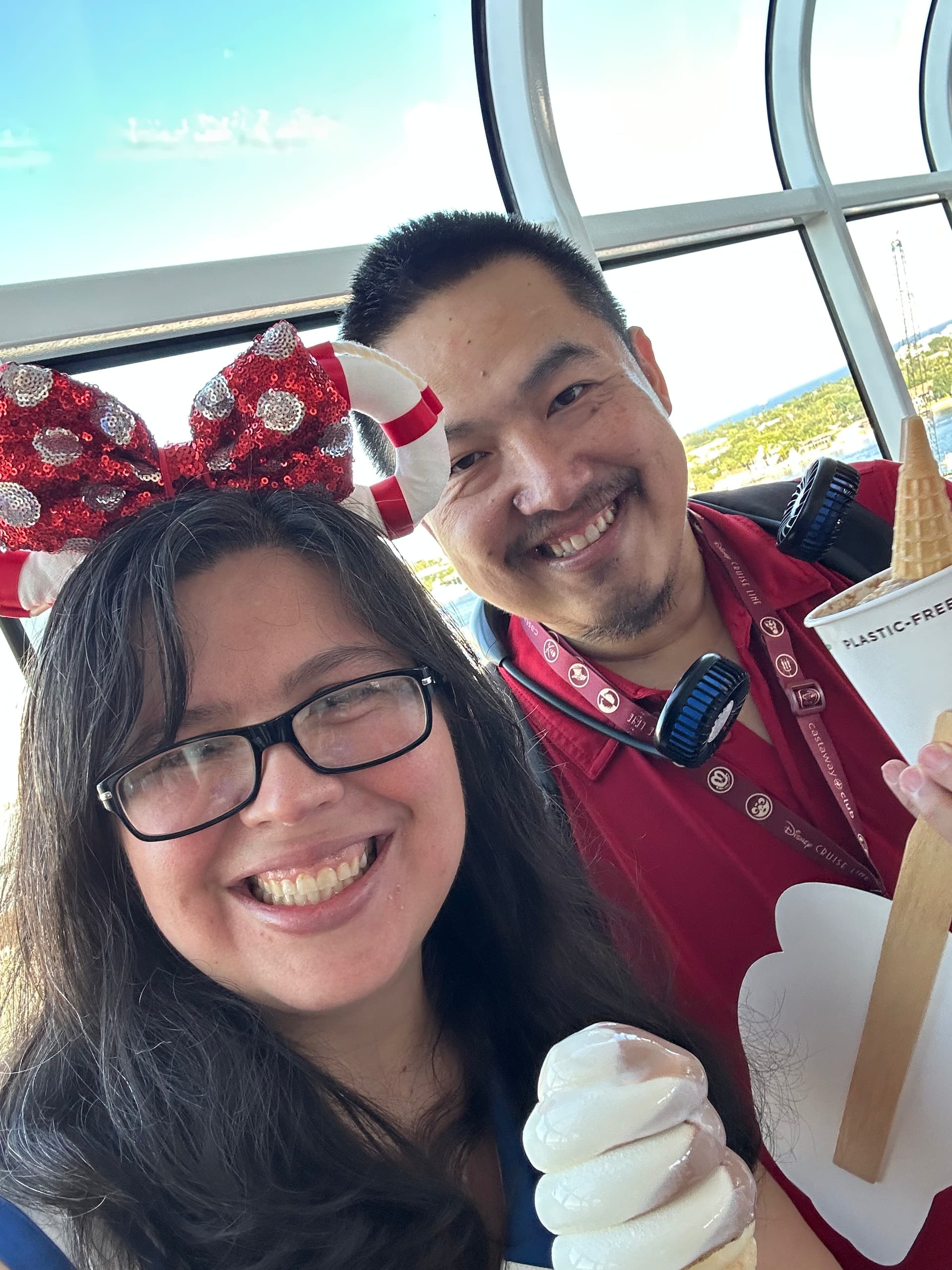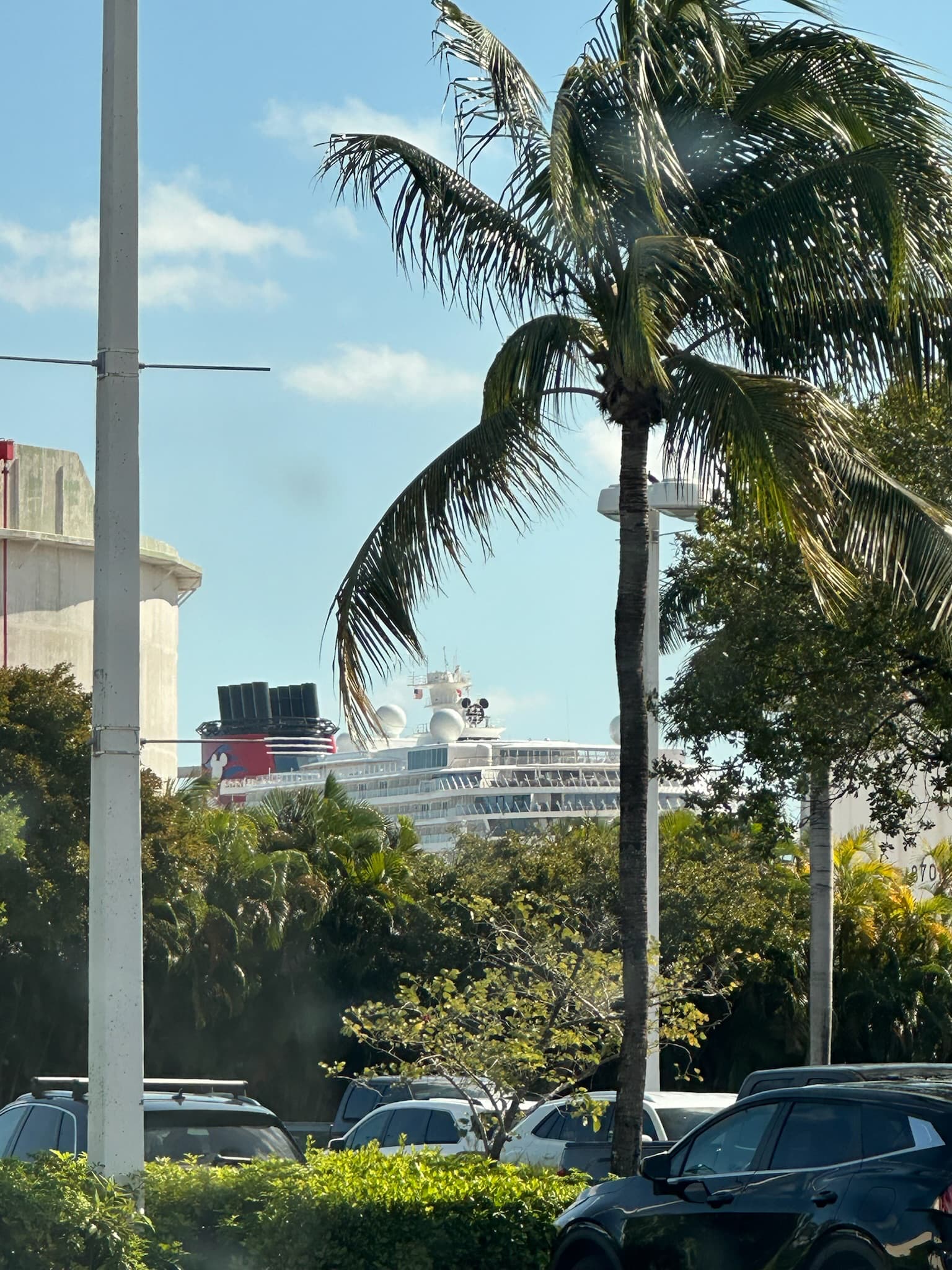 Once changed, we re-parked the rental van to be at the edge of the parking lot so I could rearrange suitcases shifting any things around how I wanted for getting on the ship and adding the DCL luggage tags. It was here we first caught sight of The Destiny (and realized how really truly close we were to port).