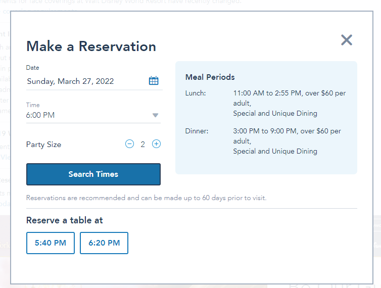 This is what it is saying: We were unable to check for available tables at this time. A problem may have occurred while looking for availability. Please ensure if you have a valid resort reservation, it is linked to your My Disney Experience account and try again.
