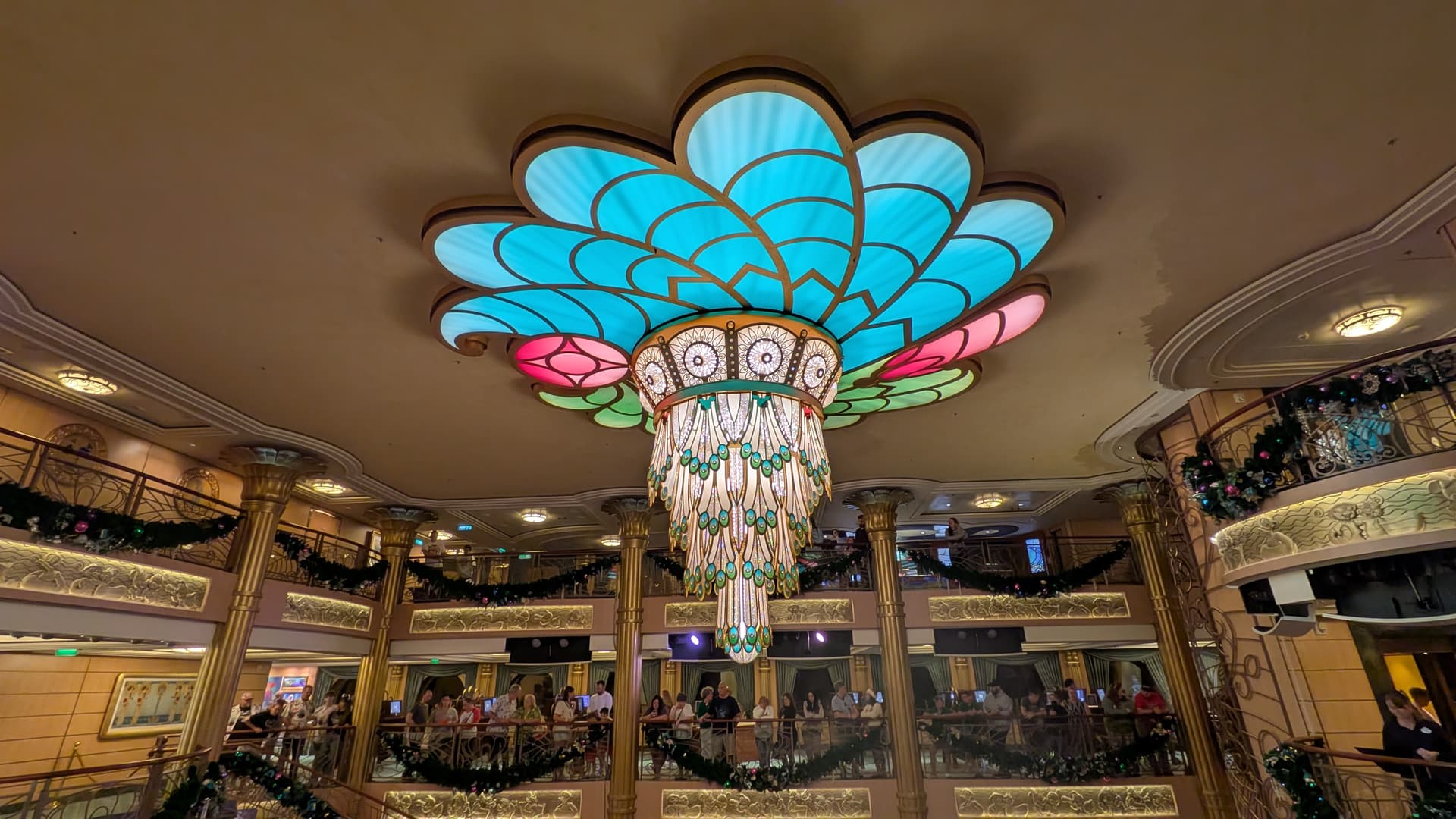 The lobby itself was beautifully decorated, including a large Christmas tree and gingerbread house. Mickey was there to wave at us as well. I later learned about some of the details in the lobby on a tour. The entire ship is heavily inspired by Art Nouveau, so you will find references to peacocks throughout the ship. The lobby is no exception, and you can see it in the giant chandelier as well as the carpet design.