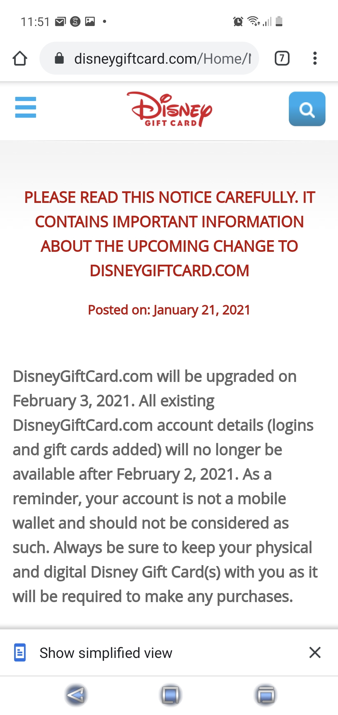 DisneyGiftCard.com will be upgraded on January 20, 2021. All existing DisneyGiftCard.com account details (logins and gift cards added) will no longer be available after January 19, 2021. As a reminder, your account is not a mobile wallet and should not be considered as such. Always be sure to keep your physical and digital Disney Gift Card(s) with you as it will be required to make any purchases.