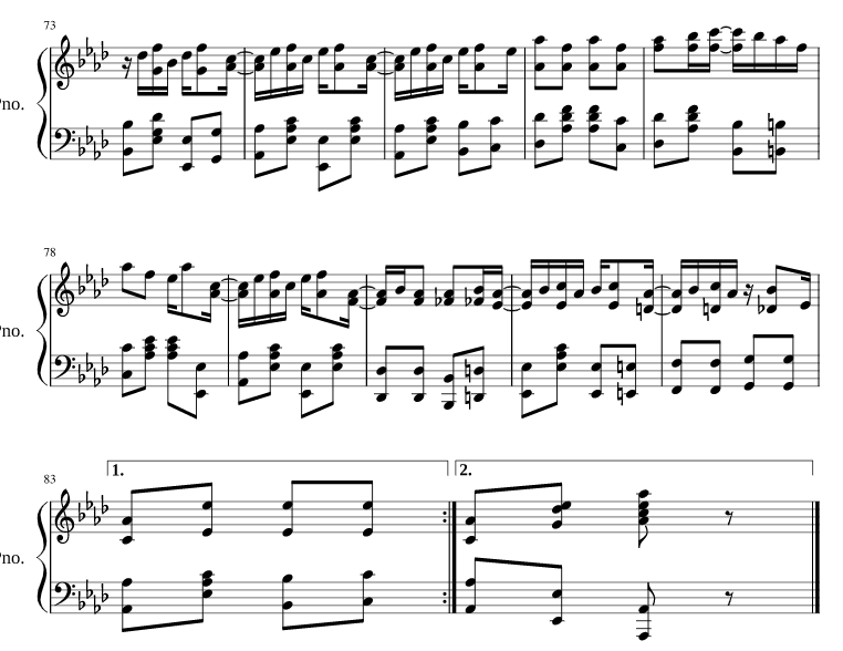 Maple Leaf Rag is originally in Ab major… although it modulates to Db in the Trio, it ends in Ab major. Since the copyright has expired, and the music is in the public domain, you shouldn’t have too tough of a time finding a copy of the original composition on the internet, but here’s a copy of the last couple of phrases…
