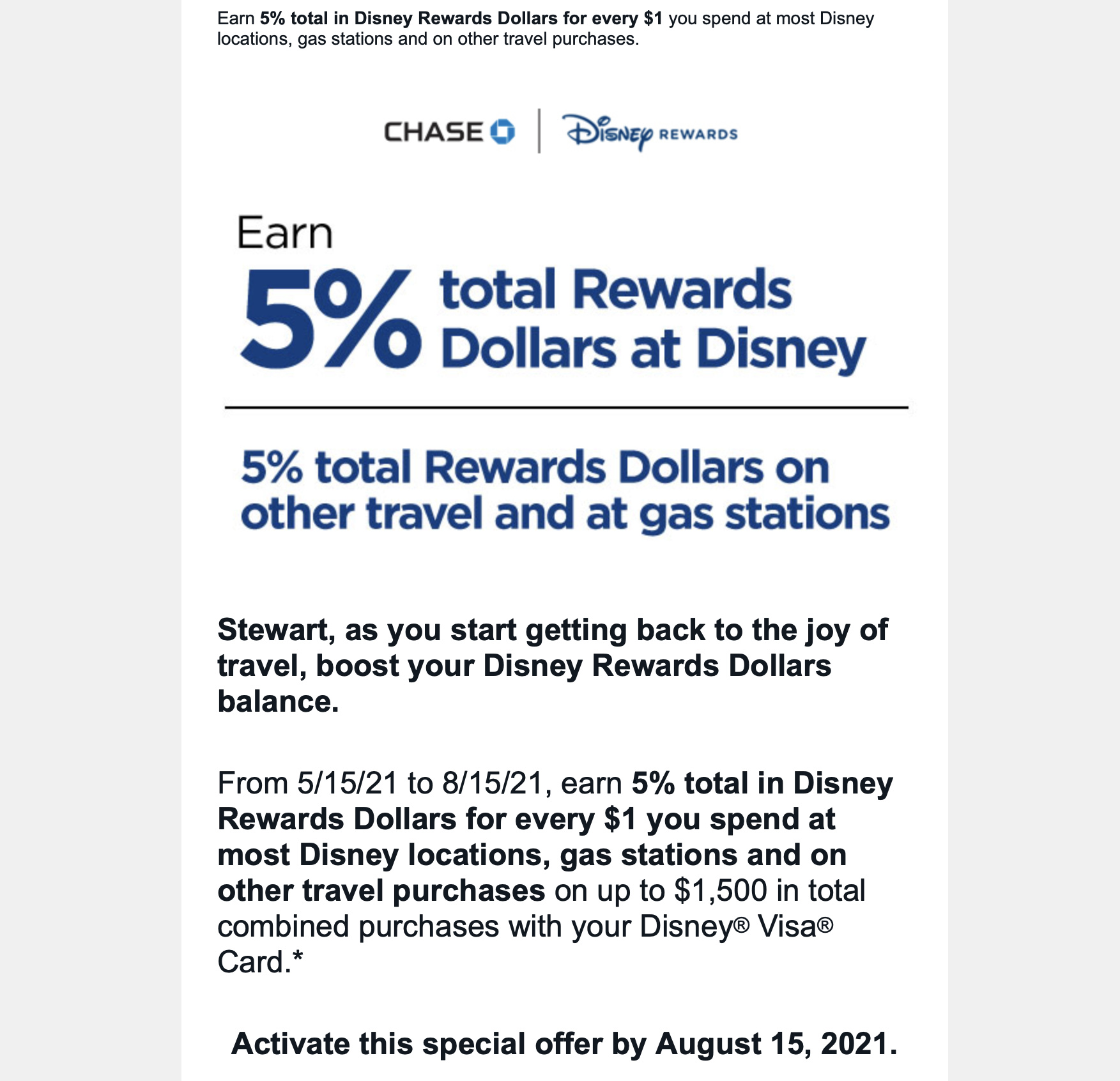 Mine came through email. I’m a current cardmember (since early 2000s I think)… I have an Amazon credit card through CHASE and I got the same offer (but not for Disney rewards, and just the gas/hotel/travel general categories).