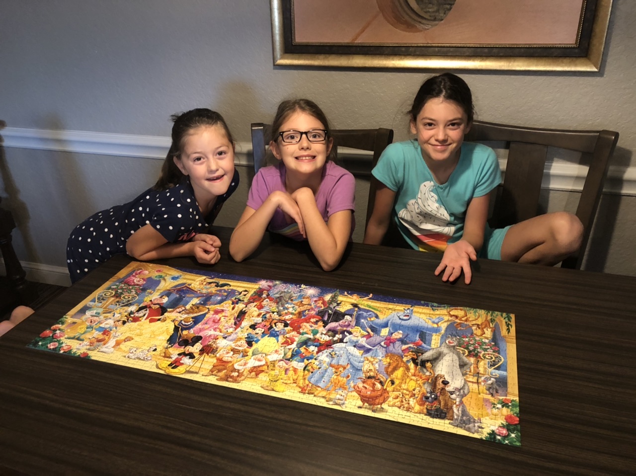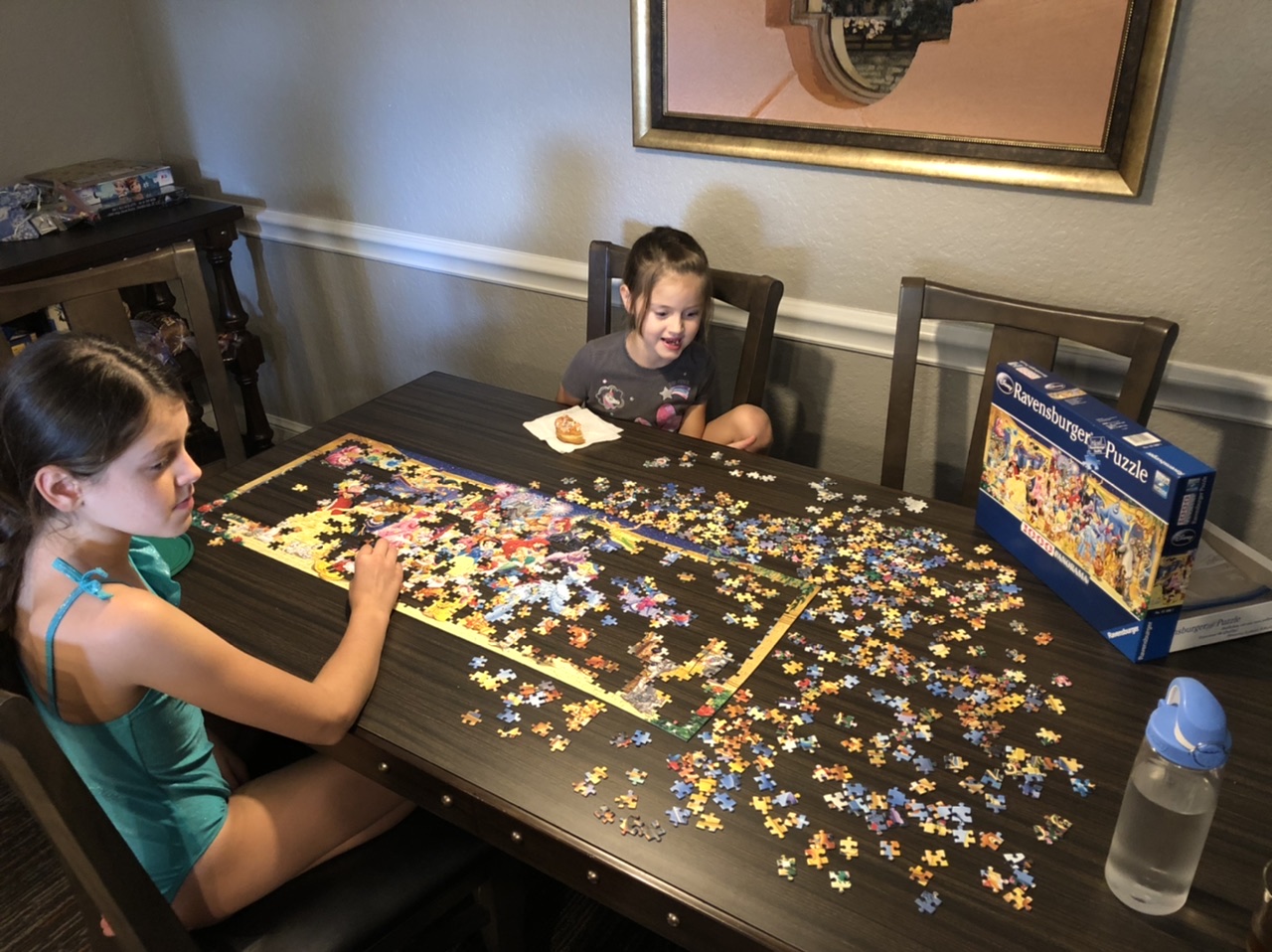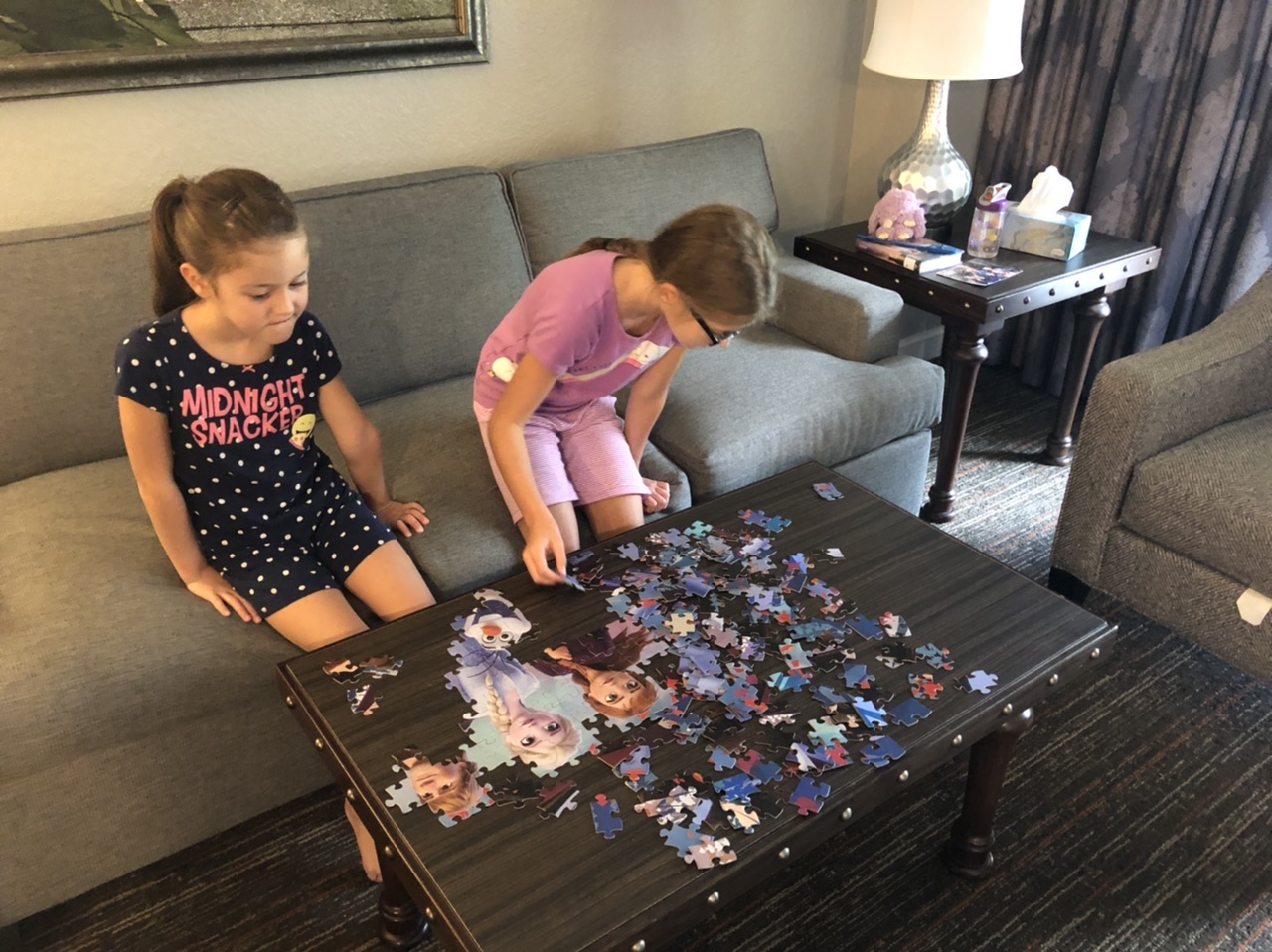 Waffles with strawberries for breakfast. Finished the puzzle. Working on another one while listening to Disney music. Getting laundry done, external charger charged, checking whose magic band is whose, packing the park bag for tomorrow, etc.
