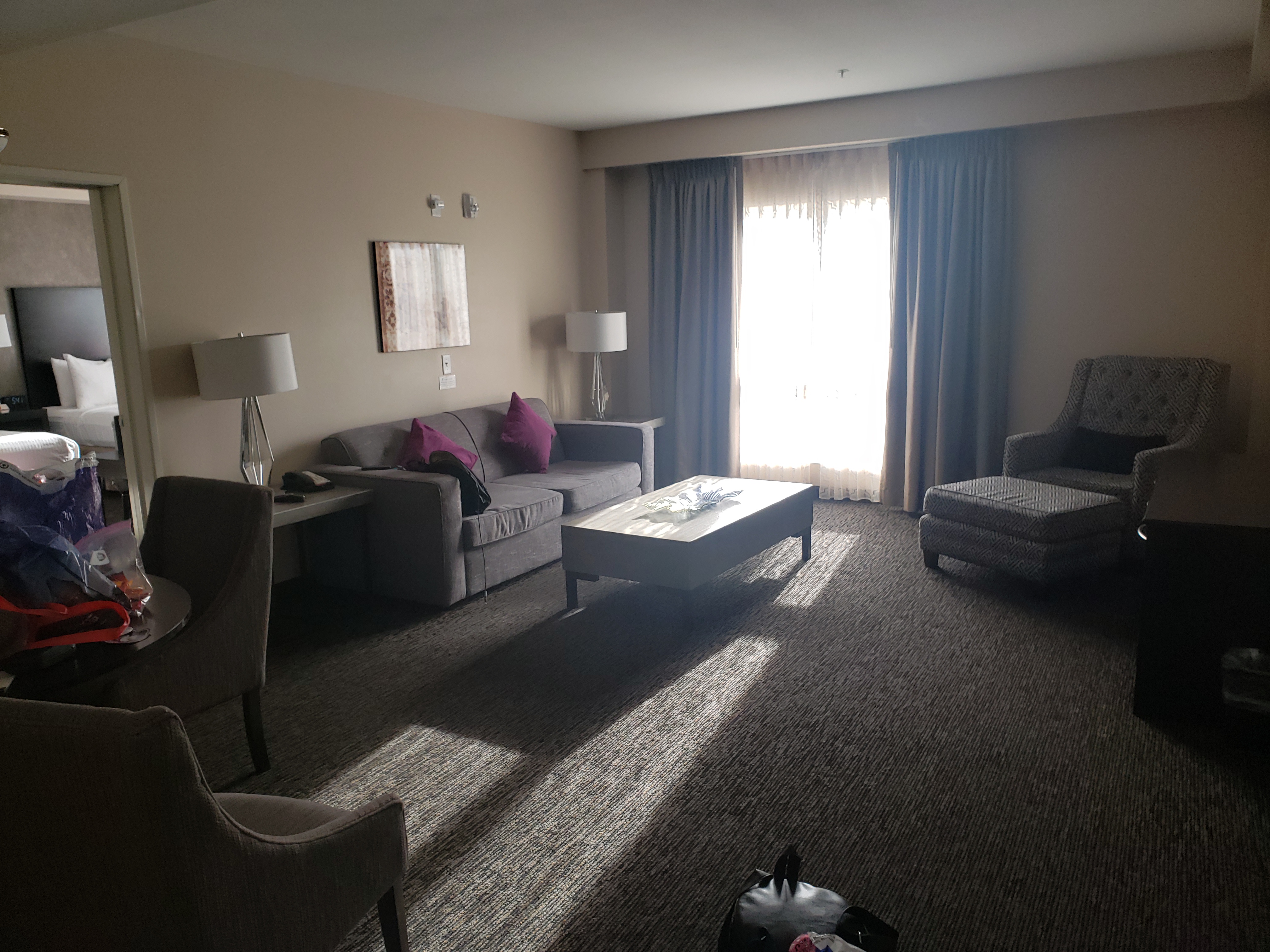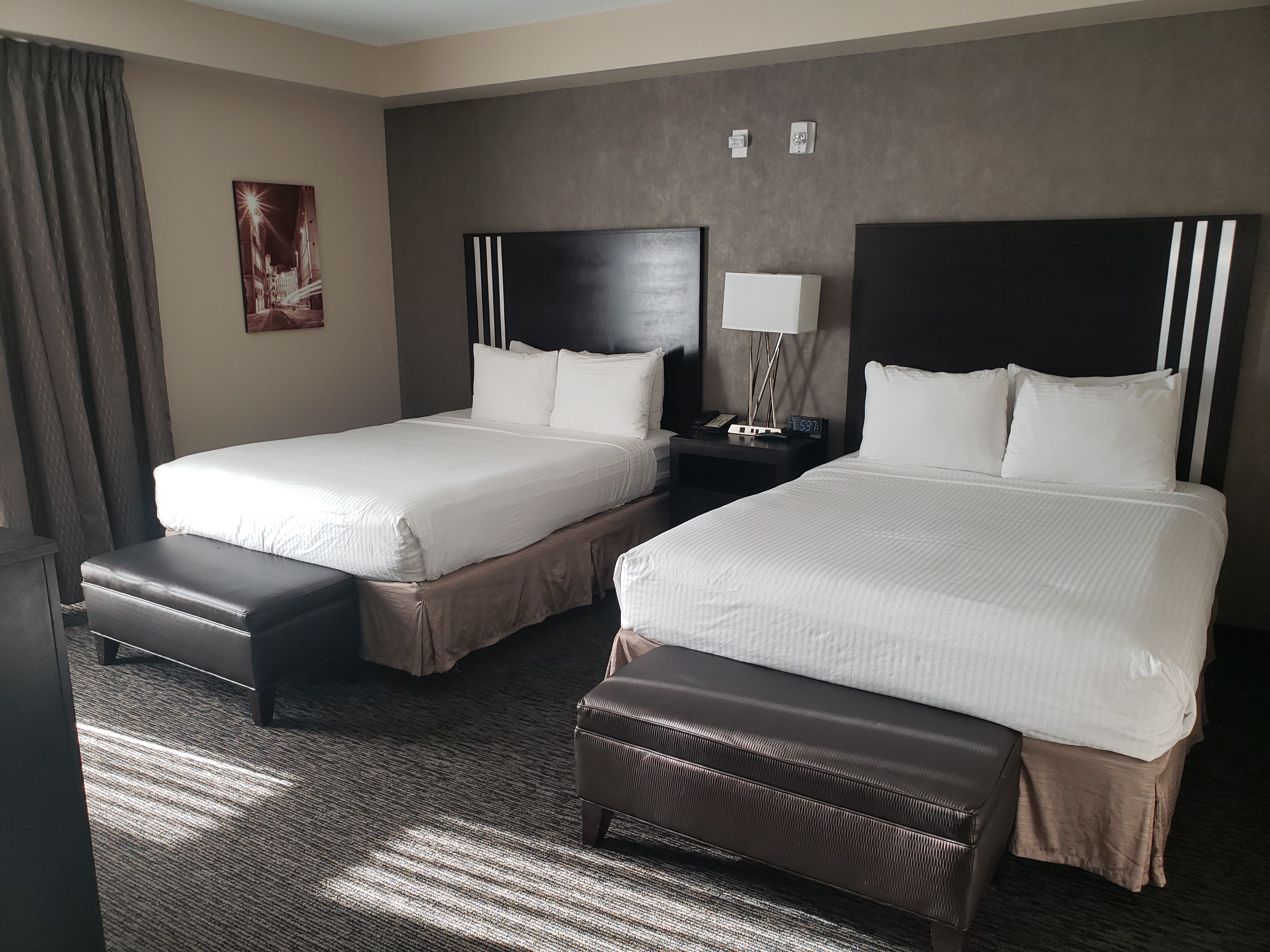 This is the 2 room suite at the Grand Legacy we stayed at in March. ( $ 173 a night ) 4 queens with a sofa queen sleeper. 2 bathrooms with the sink outside the bathroom. The front tower is nice when there is no band playing at the Rooftop bar. When there is you can feel the bass thumping. If it 80z All Stars playing than that’s OK