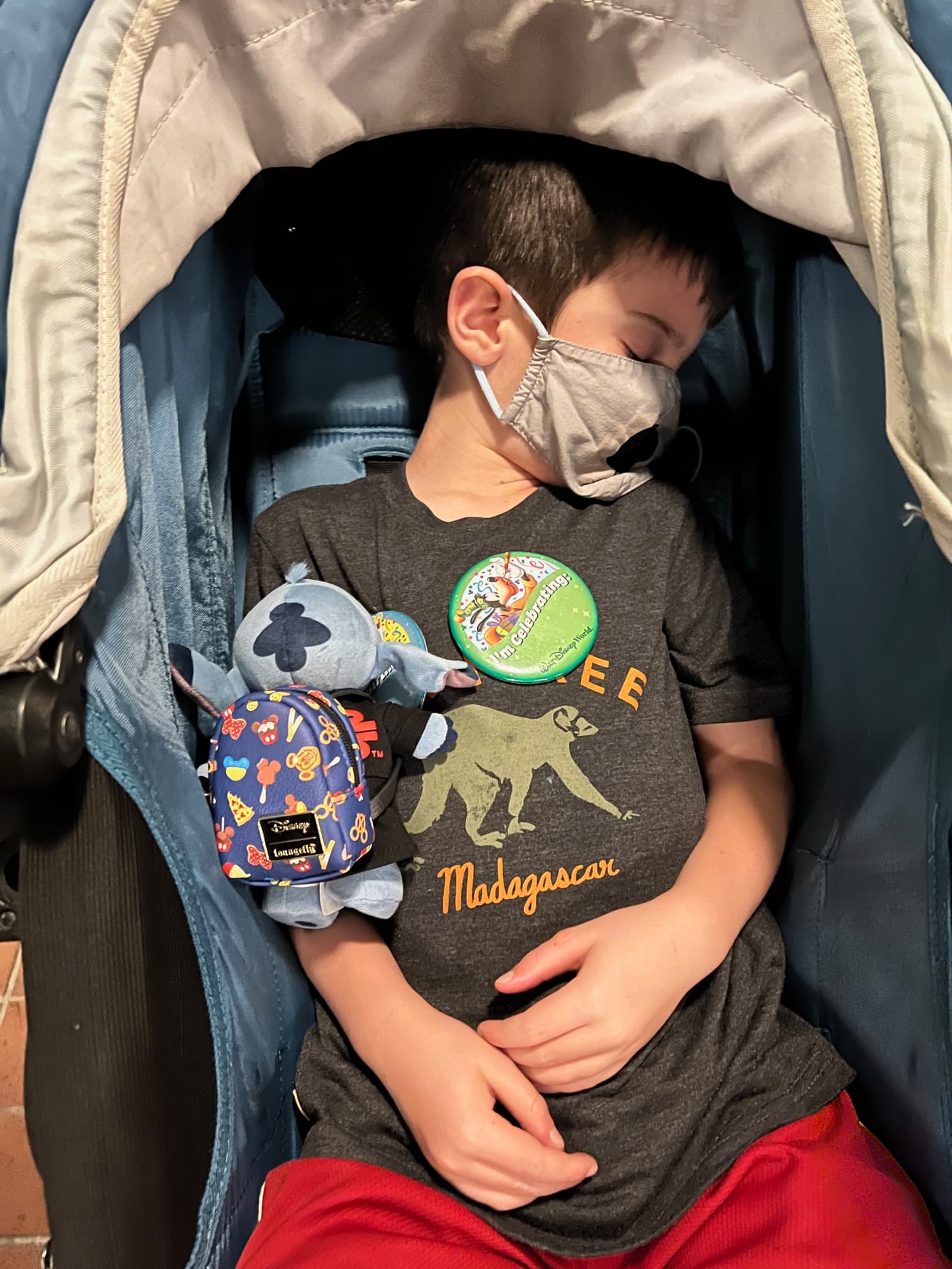 So, 12 hours after the LL we’d originally booked, we finally used our LL for Jungle Cruise. It was pretty cool in the dark! I think a lot of the jokes were lost on the kids. We had hoped to use our last anytime for one more ride on Big Thunder but everybody was way too tired, so we headed out of the park for one last time with W, who was definitely awake when he got into the stroller off Jungle Cruise, falling asleep before we even made it out of the park.