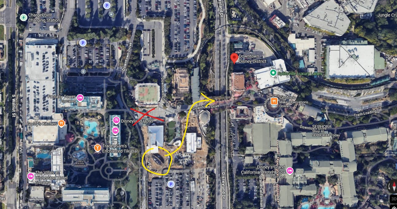 I marked up the map below showing the old plaza (red X) and the new one (yellow circle) with the direction you would go into Downtown Disney.