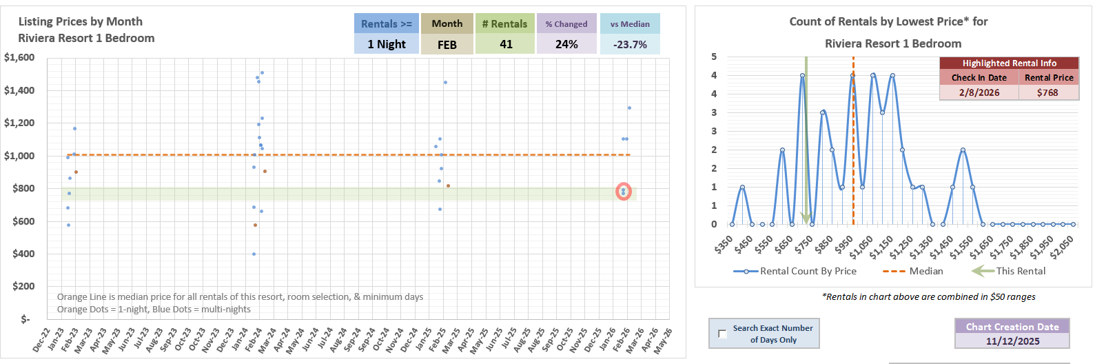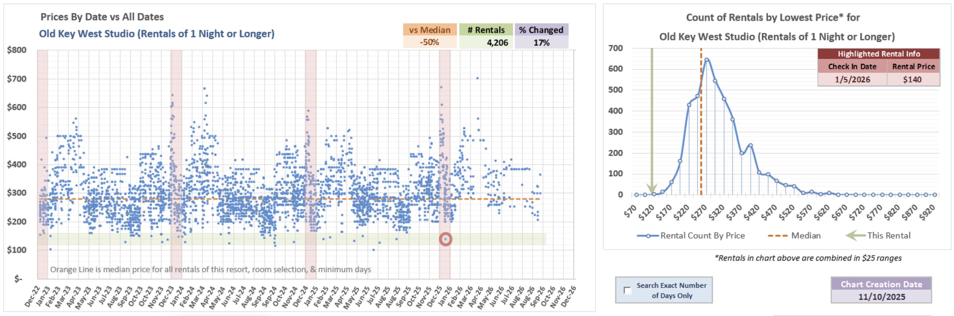 This one is a very low volume room in listings - only 14 listings in January, only 172 in total since 2023. Other time frames in previous years had lower prices - but that has really died out since 2023. This is not only the lowest January price recorded, but forget about 11-nights!