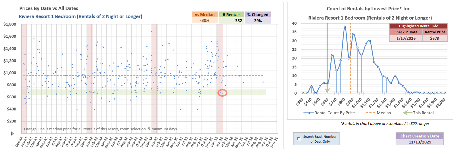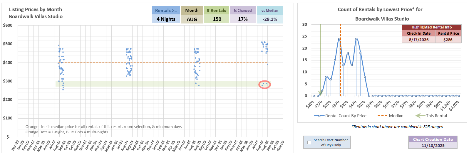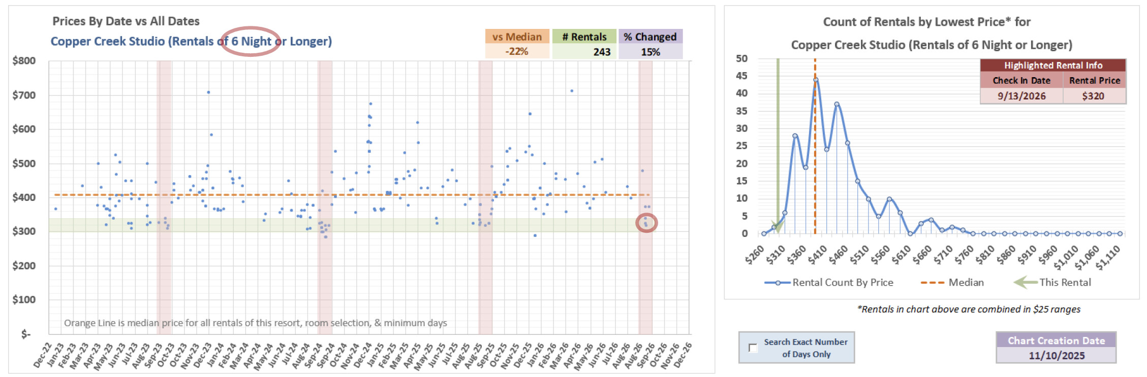 Interestingly for the month of Sept specifically, this one is really just under median - and while we’ve seen a number of lower prices, they were mostly 2 years ago, and only a few 6-nighters. My overall take: pretty darn good for the location and length, even in one of the lowest price time frames.