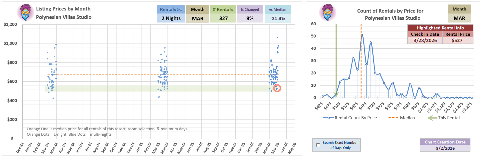 You can see this is at the lower end of the price range - but note that this chart is 2-nights or longer. Don’t let all of those dots in previous years make you think those listings above are just OK…