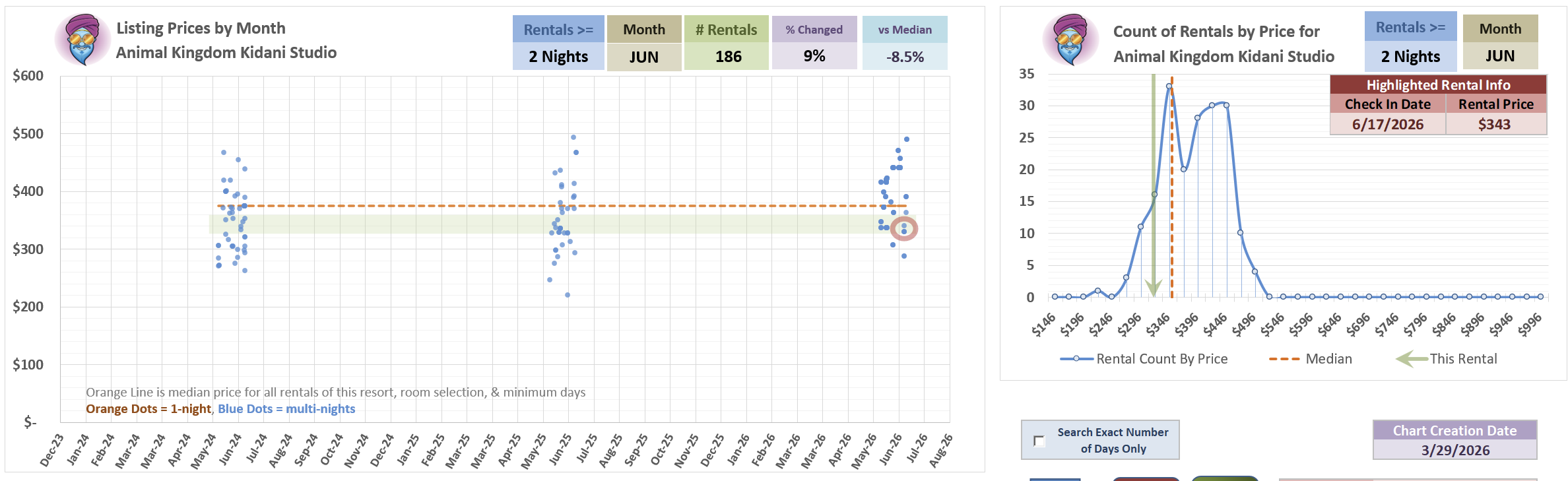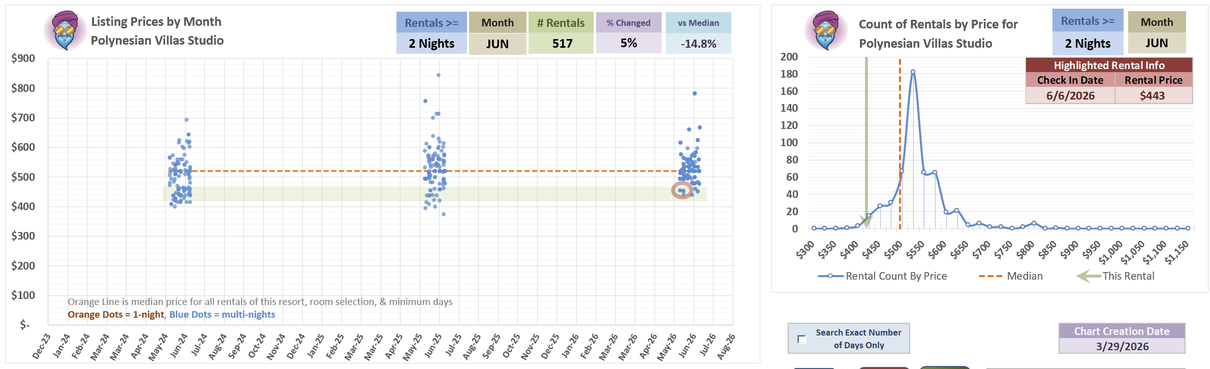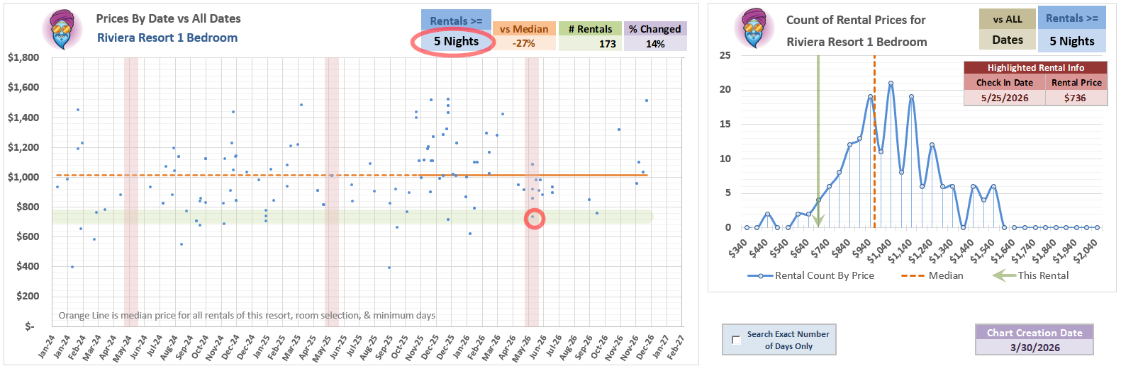 Important to note: if you filter down this chart to just look at 5-nights or longer, most of those listings go away, including ALL of the May listings anywhere near this price point.