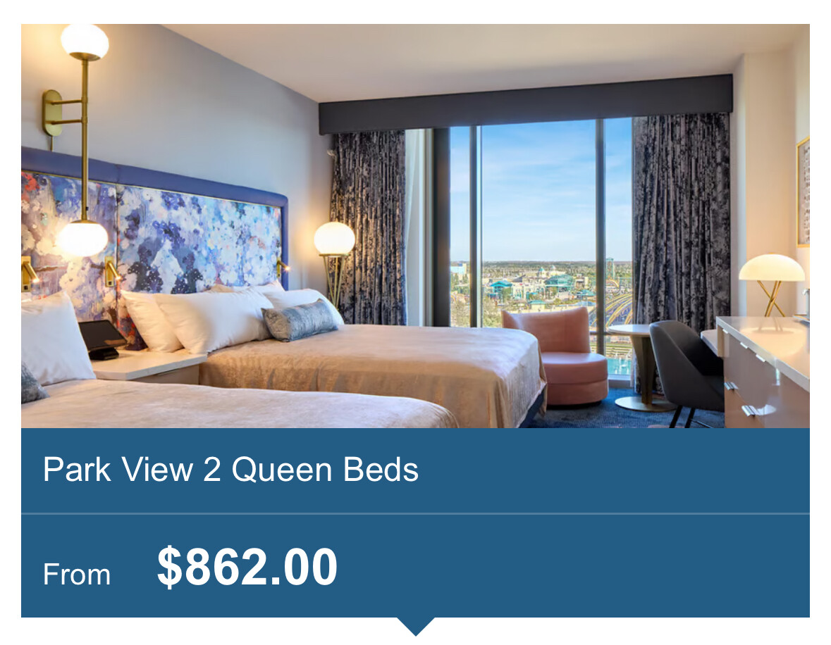 Wow, I just went and looked which is harder to tell than just looking cuz I have a package but I believe with taxes and an extra adult in one of the rooms I’m paying $500/night but I don’t know how that’s possible because I have two rooms. I do feel like each room was $300+ a night before taxes when I booked but I do not have park view.