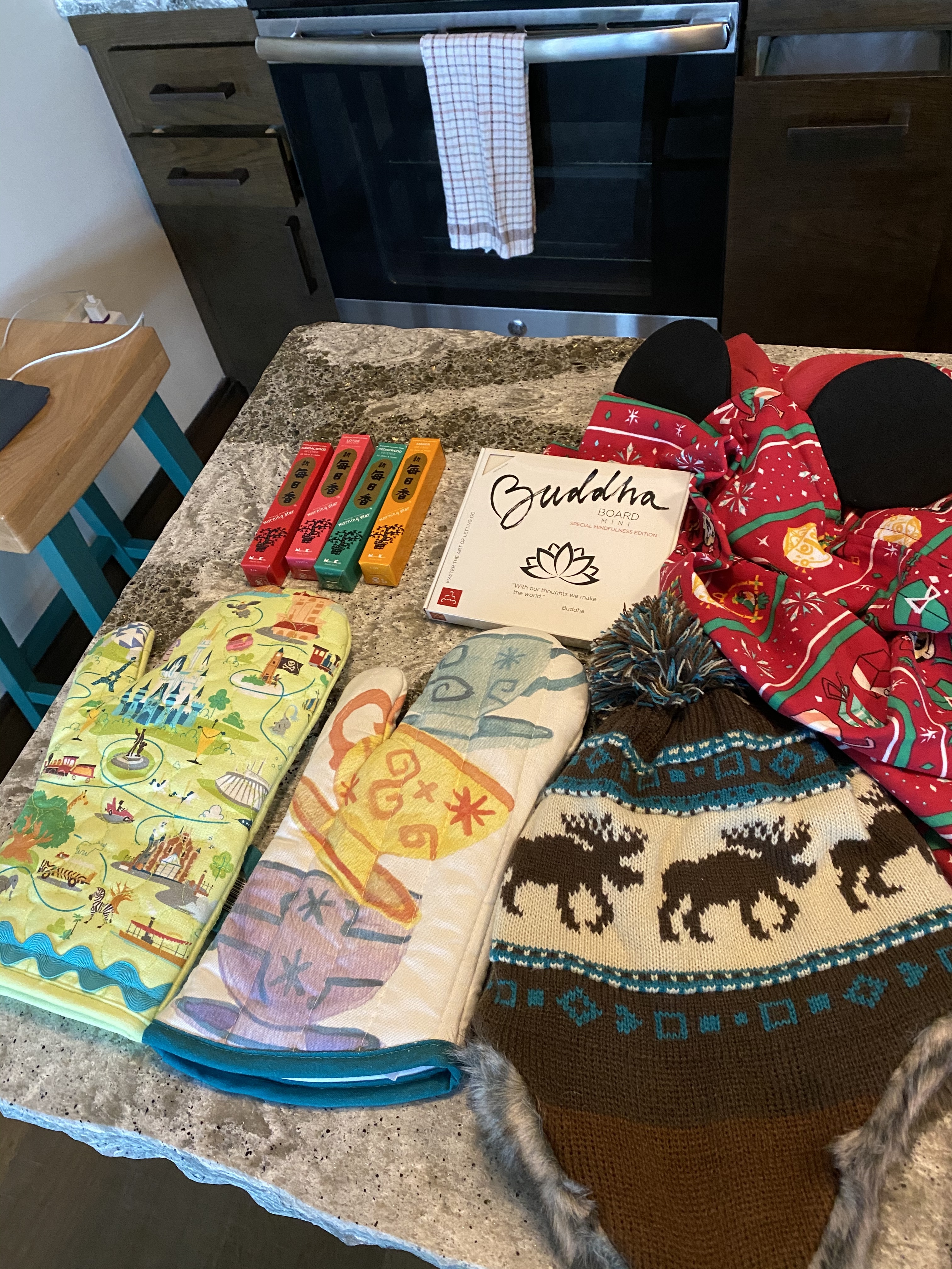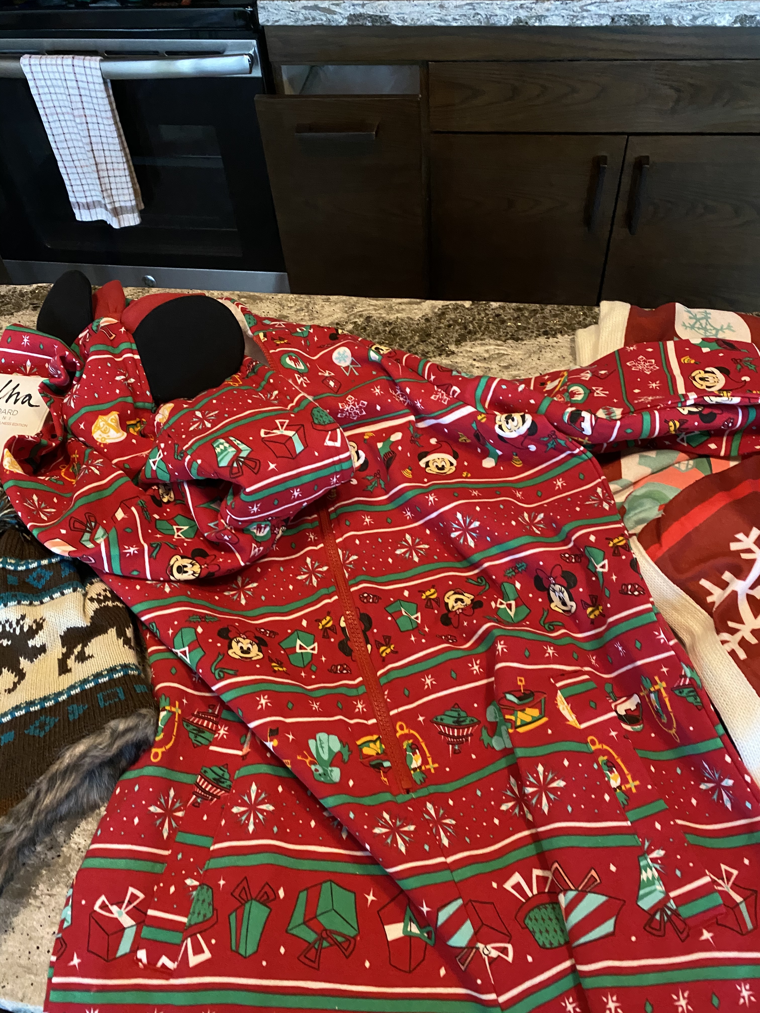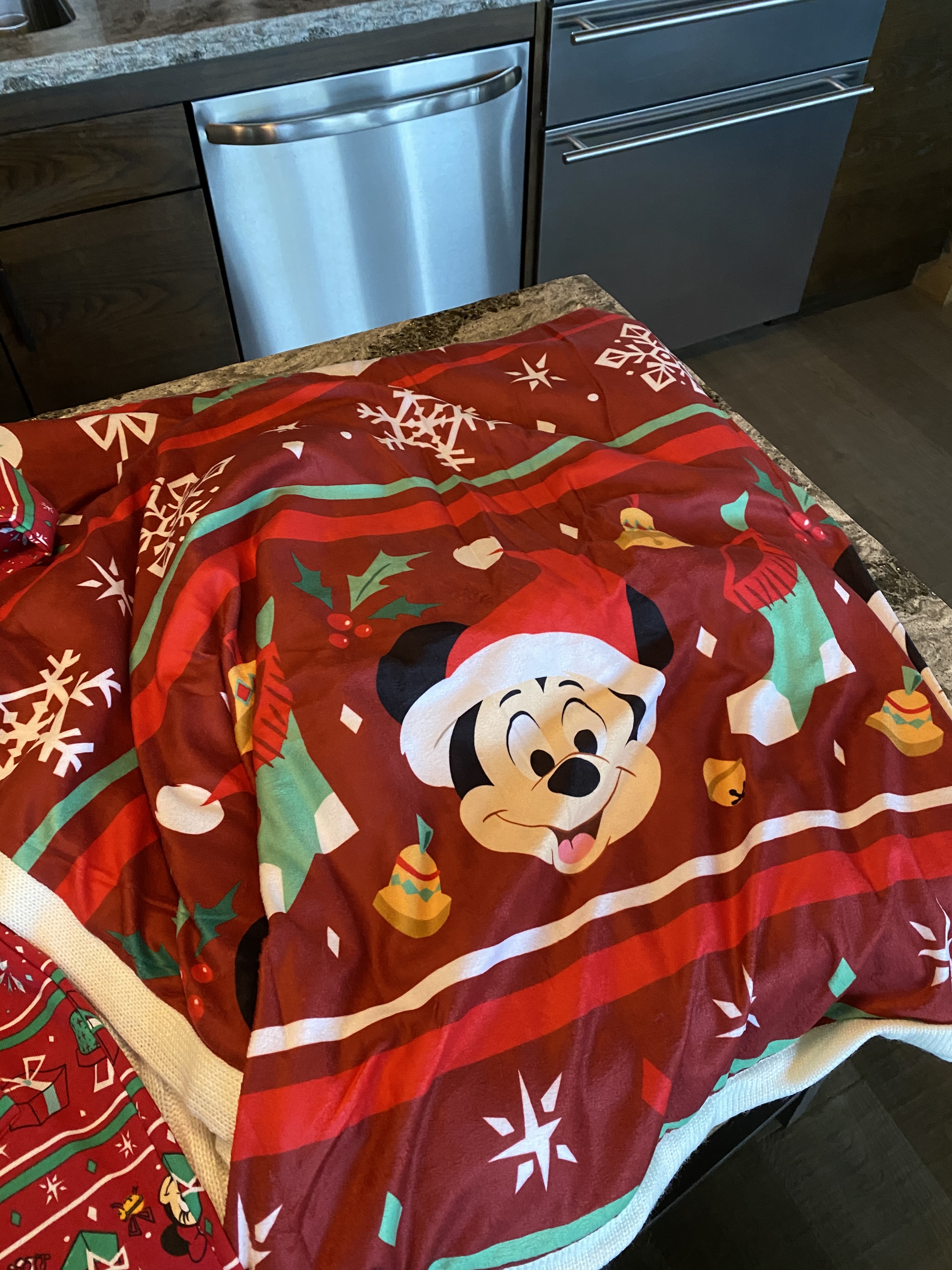 here is what i bought for me yesterday. New oven mitts, a cuddly hat in Canada, Christmas Disney onesie, and a cuddle blanket