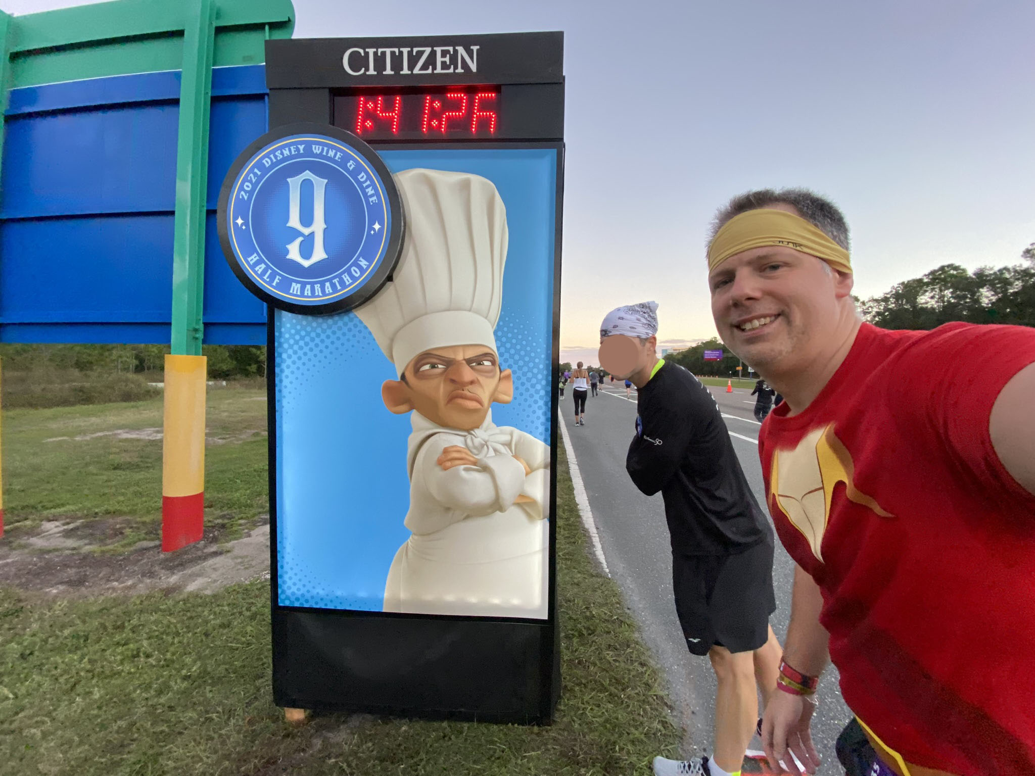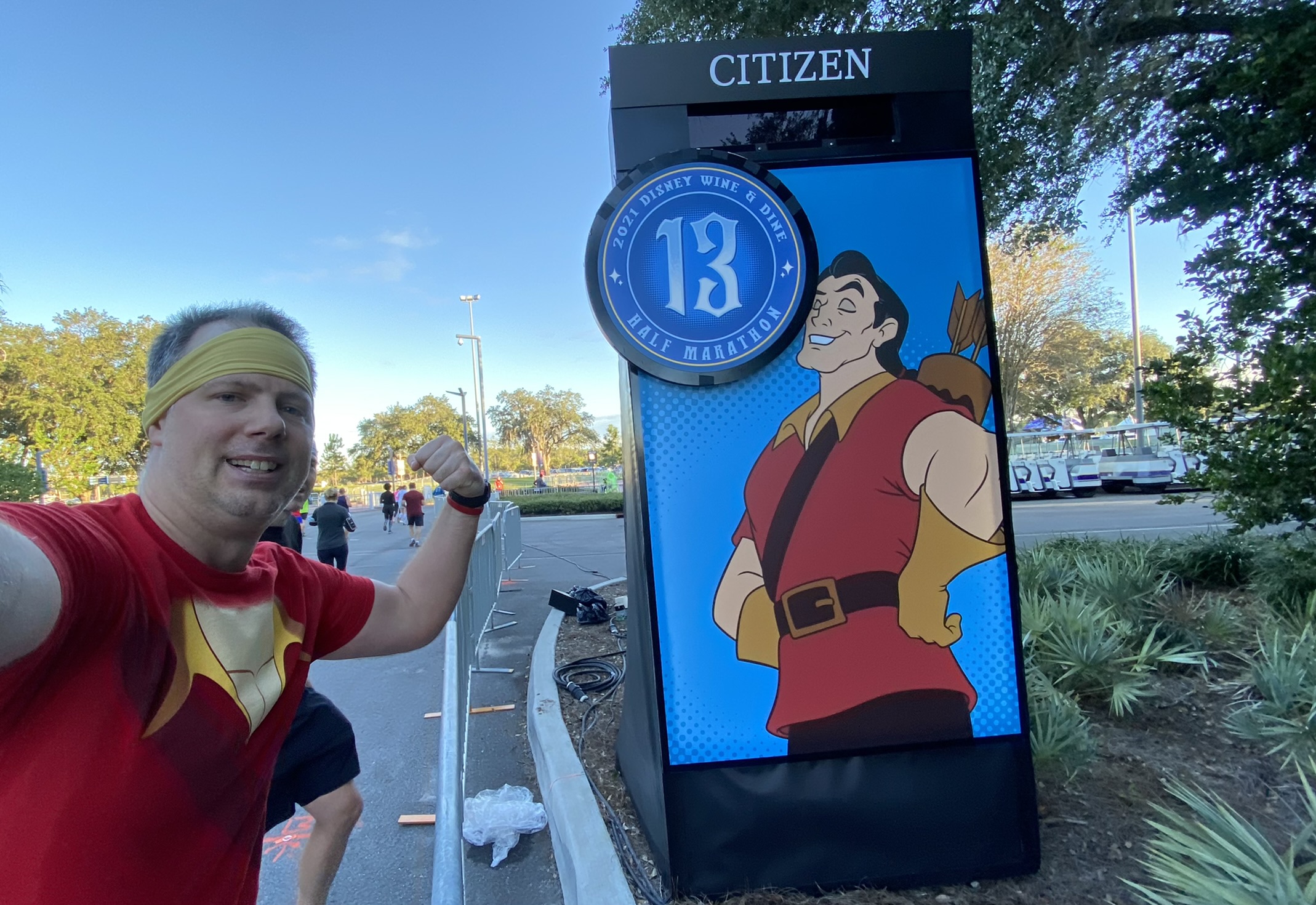Between HS and EP we followed the walking path to Boardwalk. Saw an Yzma DJ and the Queen of Hearts. Then we were through the IG across the bridge to France and went CCW around WS to the front, then by SE and out near the front entrance. We saw Jafar, and Honest John and Gideon. They saved the best villain for the last mile marker (Mile 13): Gaston! That got me going the last 500 feet to the finish line.