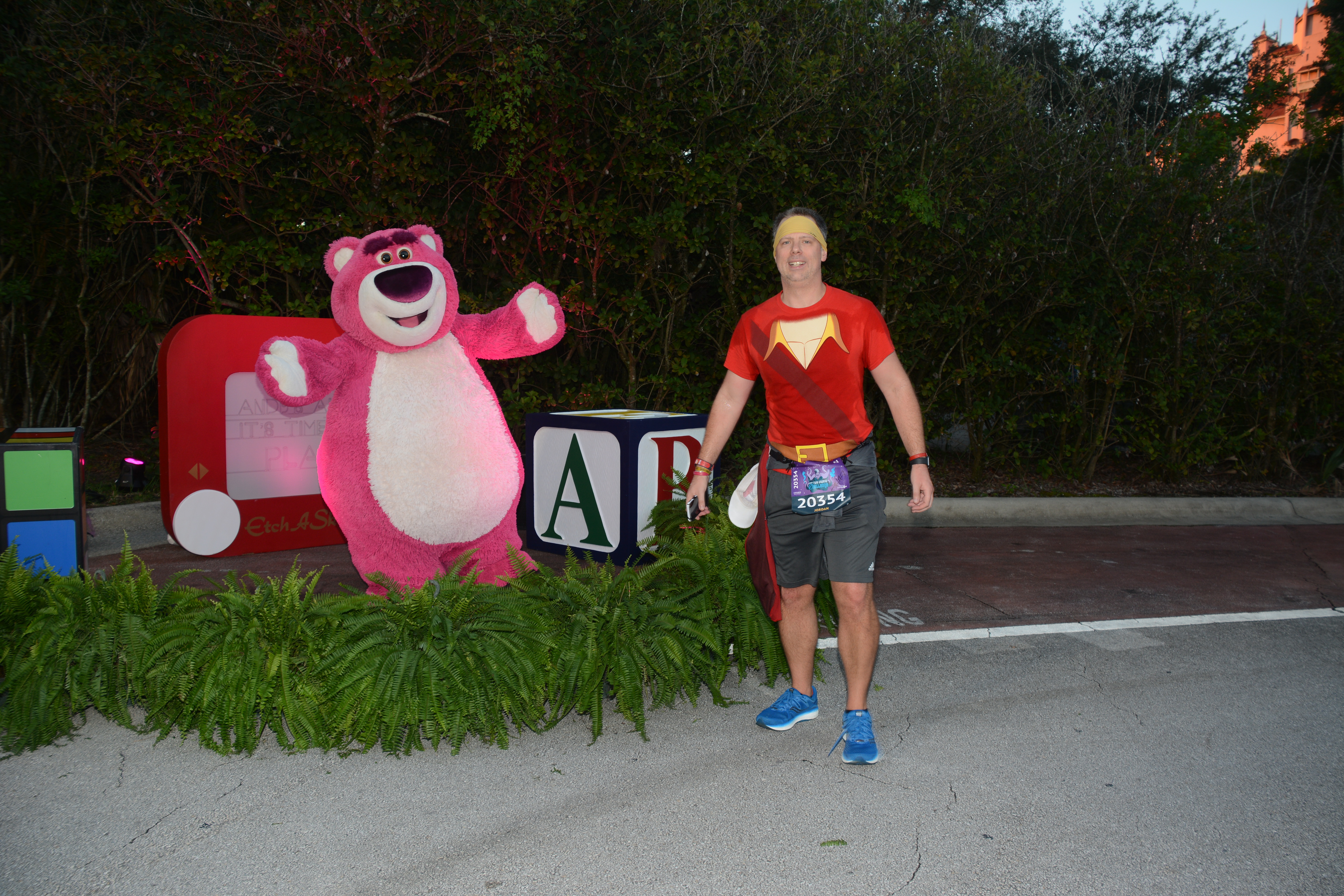 Mile 10 was at our entrance to HS, and Lotso was stationed nearby. Quick trip in this park, just like the 10k. In a back gate by Fantasmic, by ToT and down Sunset Blvd to the BaTB theater, then left out another gate that dumps out by security. This was 650a-ish.