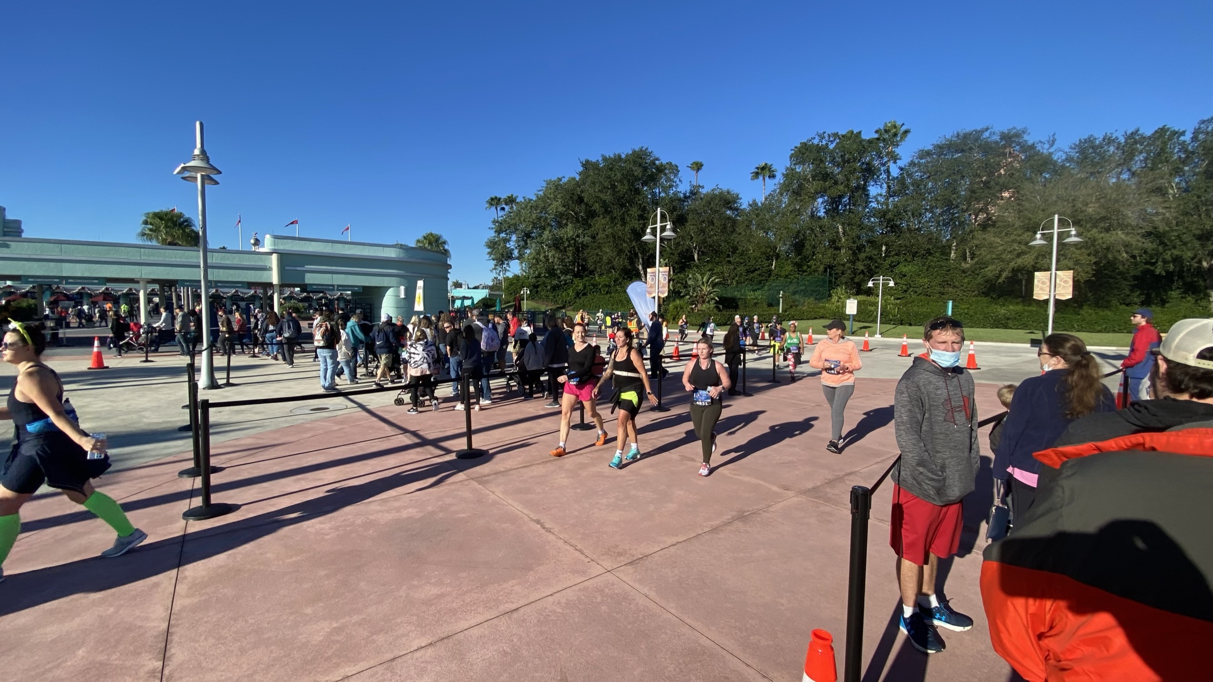 When we arrived at HS, people were still running, but it was getting to the end. Since we used the Skyliner, we had to cross the course to get into the park. There was one spot to do this. The way this works is there is an “island” in the middle of the course, and the course volunteers force the runners down one side while pedestrians cross the other side, and after the island is full of people, they switch to running the other side and pedestrians cross the other. I drew a simple schematic, but also including a pic.