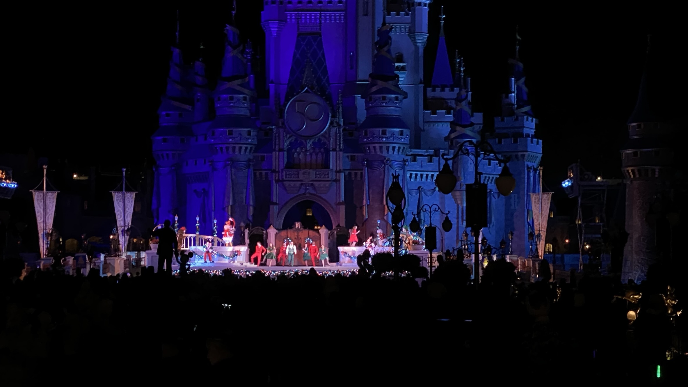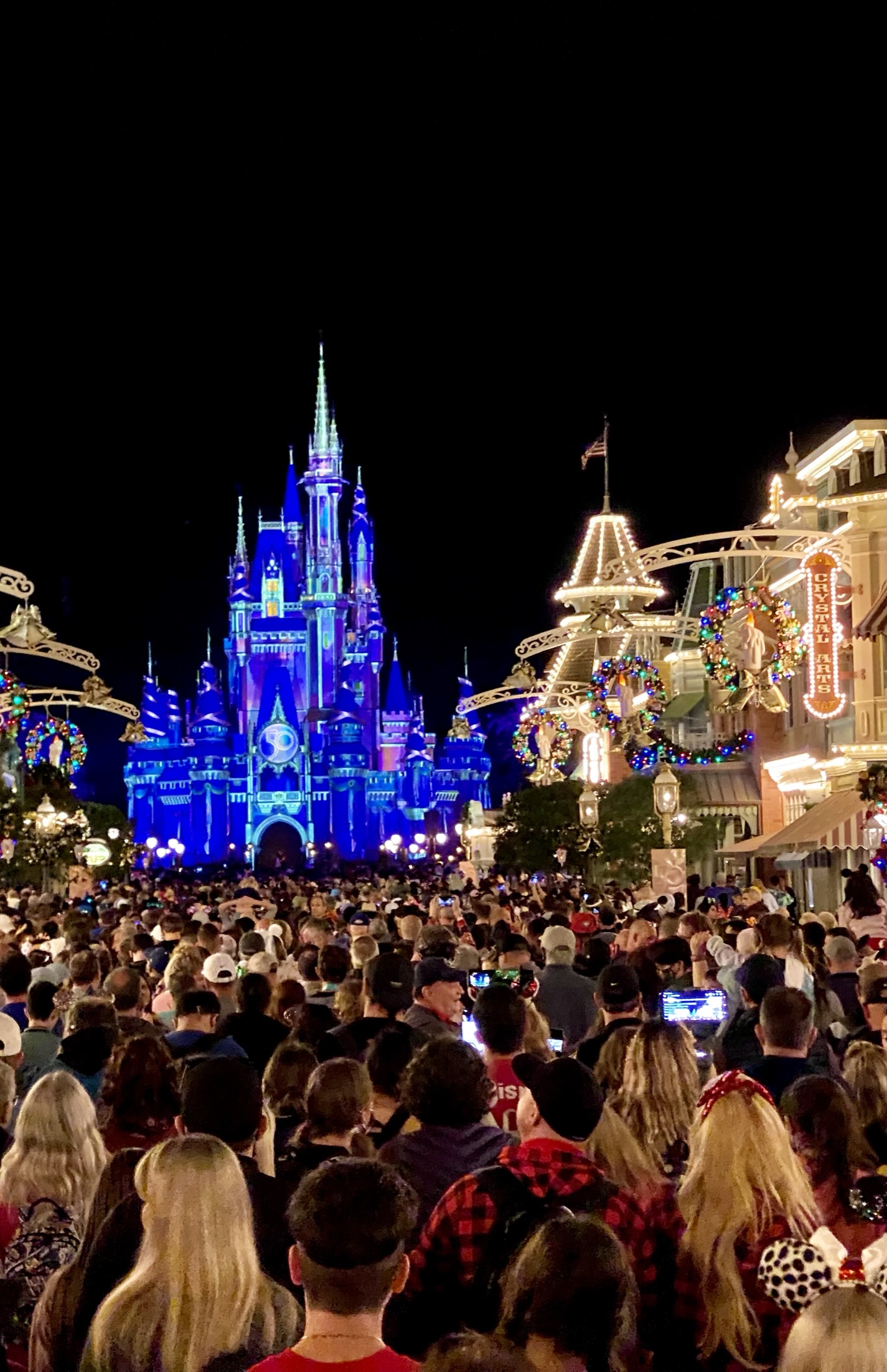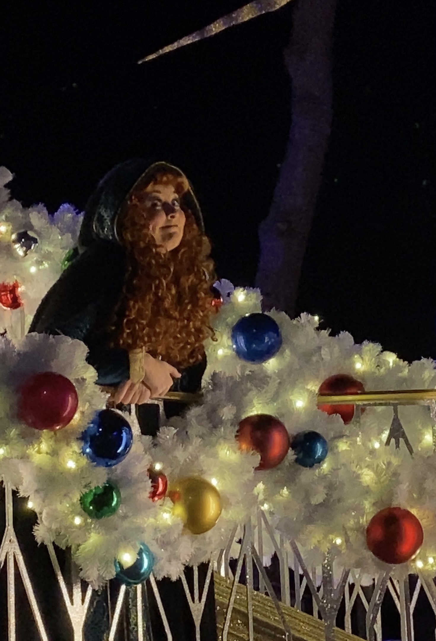 At 730p I was standing outside the train station putting on my VMAH wristband, and the crescendo of excitement was reaching a critical level. The slow approach on the ferry definitely amplified my anticipation. The Magic Kingdom was aglow with Christmas! I got to my spot on Main Street at 735p and just soaked it all in for 25 minutes when Enchantment started. For the first time on this trip I truly felt some magic.
