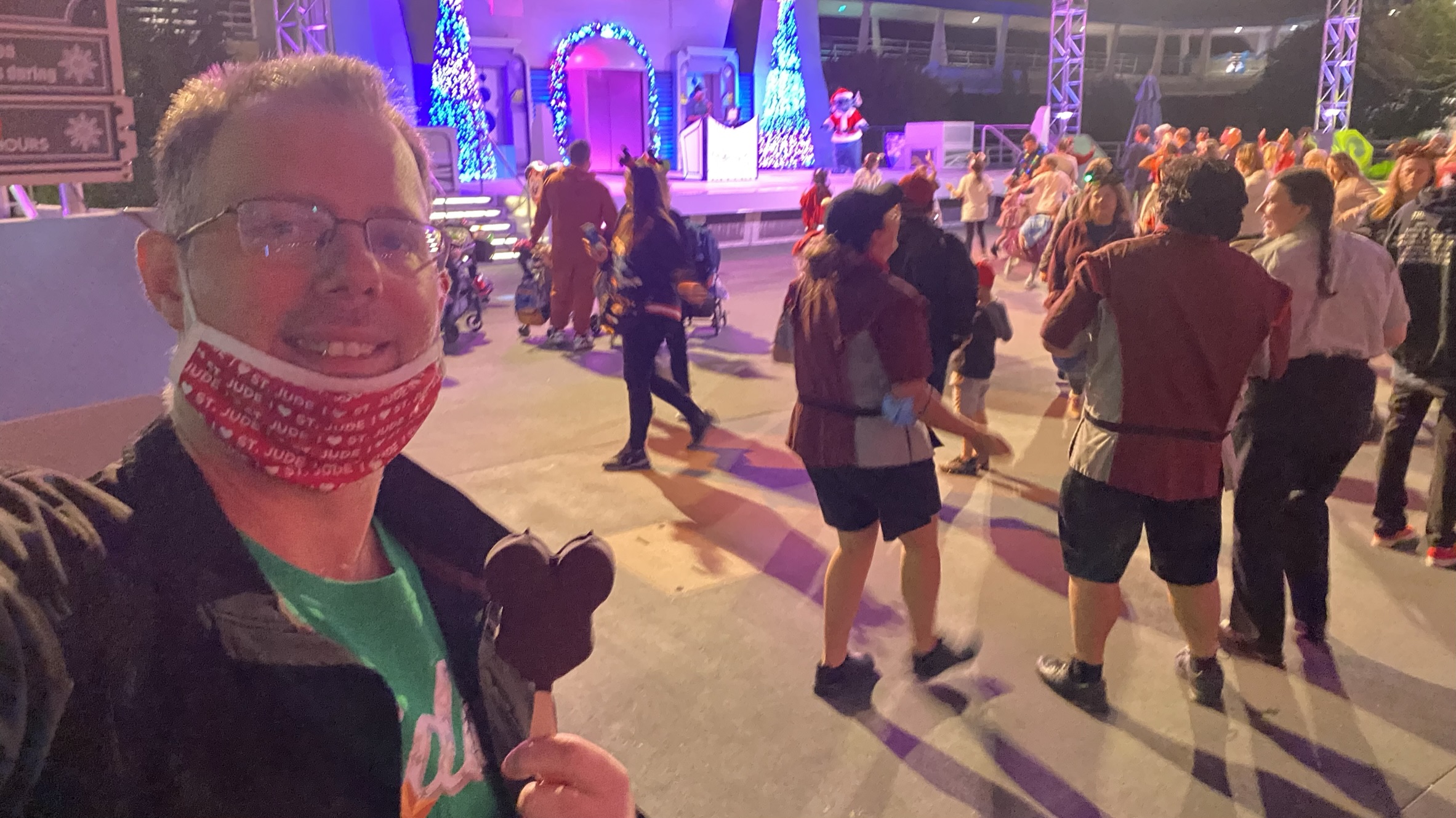 At 1135p I was riding Space and at 1140p I was eating a Mickey Bar while watching the dance party with Stitch. At this point my energy level was approaching zero, so I decided to call it a night. Caught a few minutes of the castle stage show as I went through the hub, enjoyed a few last moments on main street, and was out of the park at 1155p. At the exit, they gave us this little Mickey-shaped chocolate marshmallow which I did not care for at all. Waited a few minutes for a bus and wheels were rolling at 1207. Got to ASMu (transferred from Pop to save a little money) at 1225p to find out the room was not in my name, but in B’s name. No idea how that happened. The manager had to look up a bunch of information and I had to confirm my identity a few ways before they would change the room over to me. Got a room in the BatB building again like I did in October! Retrieved my luggage from bell services and made the long walk to my room. I was in bed at 105a. What an epic day.