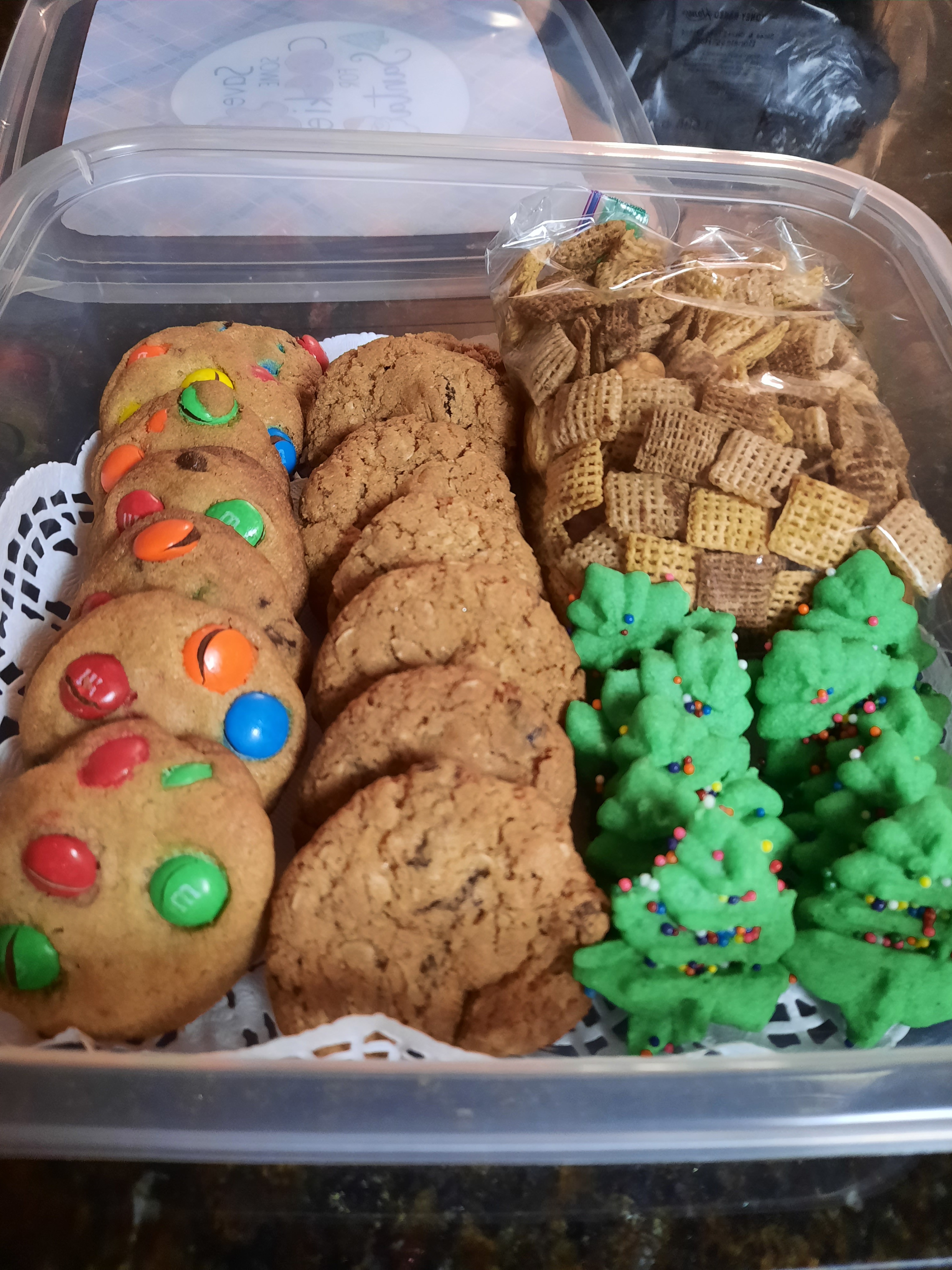 Below is a box I gave my neighbor that includes M&M cookies, oatmeal raisin cookies, almond Christmas tree cookies, and homemade Chex mix. YUM!