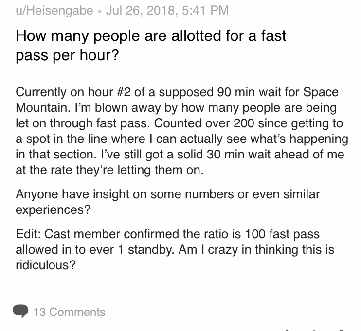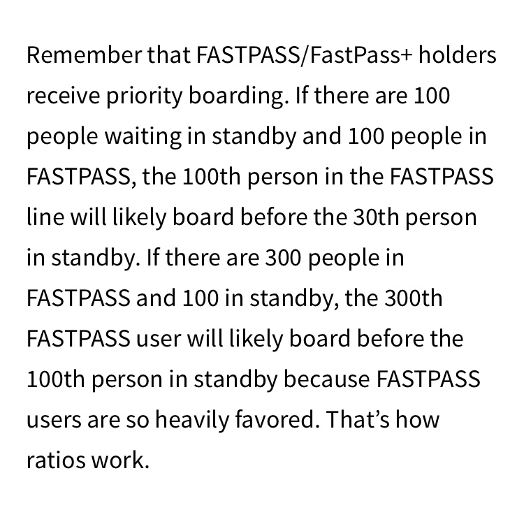 This is the biggest incorrect assumption. Standby times have not increased at all, on average, since the introduction of FPP. Touring Plans has done the analysis on this, and standby times are virtually the same (once you adjust for increased crowds). They go up for a few attractions, go down for a few, and stay the same for most. This is because, as you stated, capacity is fixed. But this is also because ridership is fixed. For a moment, let’s assume an attraction has a capacity of 1000 pph (people per hour). In the old pre-FP days, if the line had 1000 people in it, and a person got at the end of the line, the wait would be an hour. Now let’s assume (for this argument) that FPP is introduced with a 50/50 split. Now, of those 1000 people, 500 were able to obtain FPs for that hour. So they are not in the standby line, they are virtually in line and can return during their FP window. That means there’s 500 people now in the standby line. But since 1 FP person is going through for every person in standby, it takes the 500 people in standby a full hour before the last person in line gets to ride. So the standby line physically moves slower, but the wait time remains virtually the same. Again, this is proven by the wait time data that TouringPlans has and the analysis that they have done on that data from before FPP and after.