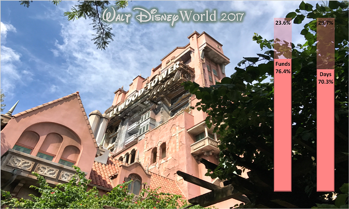 I update a bar chart each day and have it as my wallpaper on my PC. I have it rotate with other charts I’ve prepared that track the money we’ve saved for the trip so far. I’ve removed the currency data from the charts here, because it’s an embarrassingly large amount of money we’re spending, but I’m sure everyone here can relate.