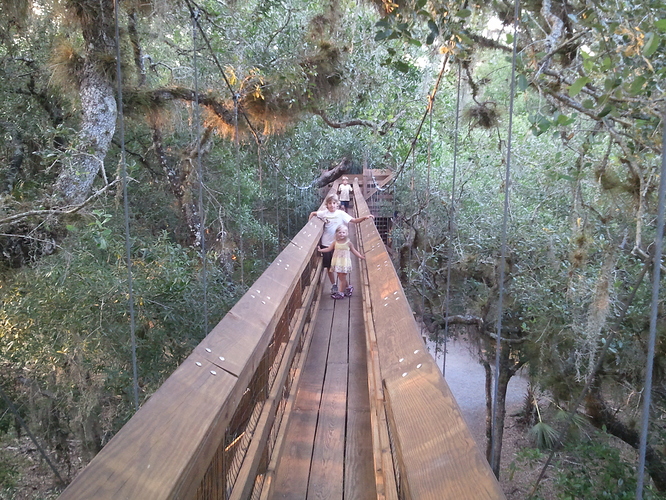 Myakka State Park. This is actually kind of between Sarasota and Bradenton. State park. Great trails. Boat tours. Tree top suspension bridge and lookout tower (amazing views) They used to have a small walkup cafe type place where they load for the boat tours, they sold âgator nuggetsâ back when. Not sure if they still do, but if you are an adventurous eater, you can eat yourself some giant lizard!