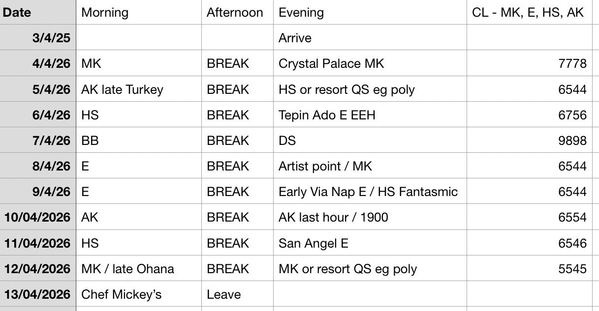 Do your best or worst… looking for thoughts on initial high level plan. Staying 10 days at AKL in early April from uk. 4th visit (2nd to AKL) Me DH DD19 and DS16. Initial plan below. We know we like to RD and visit parks in eve with break in middle. Will do some LLs but would like to try and limit due to cost - any recommendations? Have added current CL predictions on the right. We like 1 TS per day. Still need to think re any QS