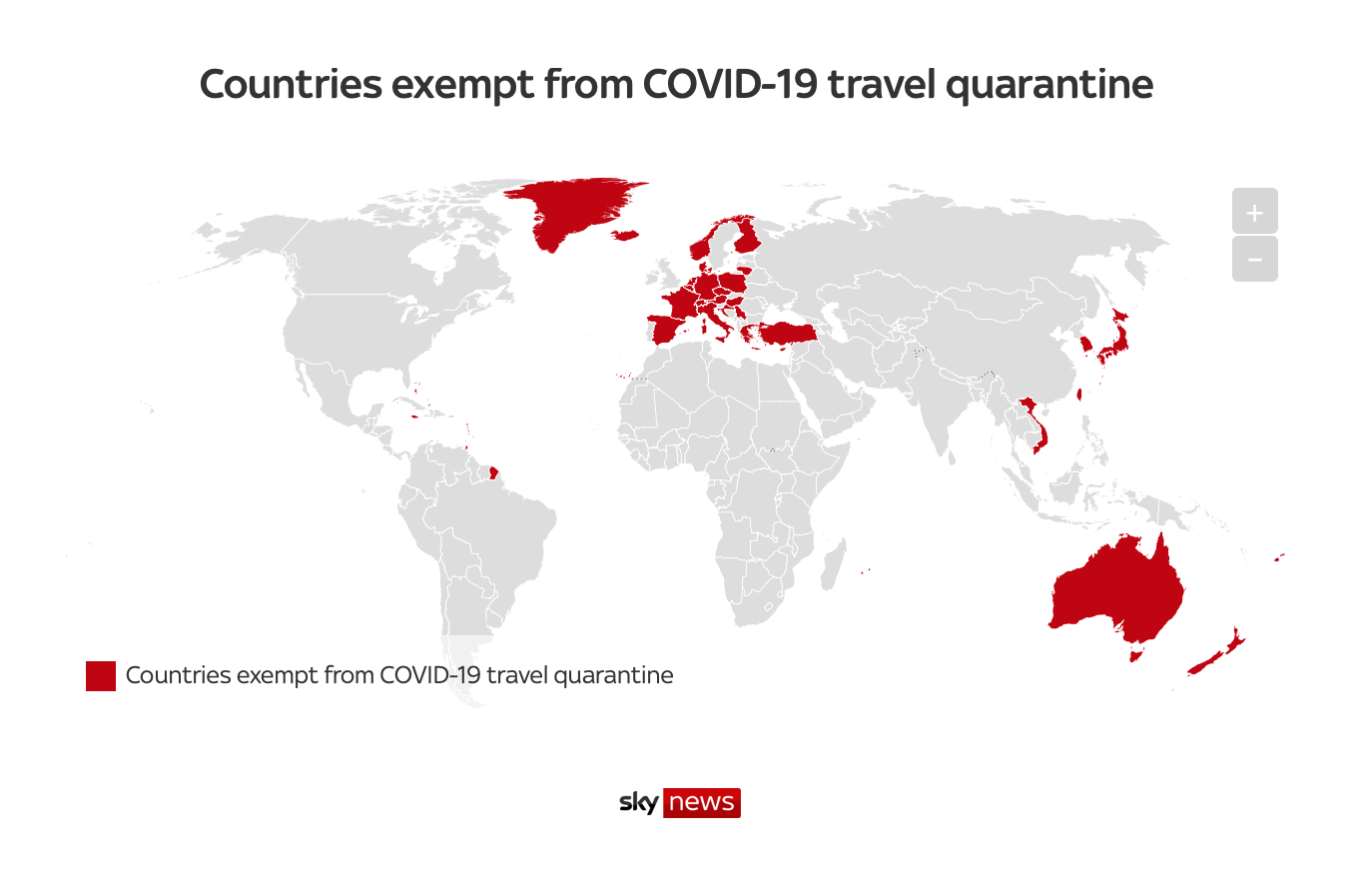 This map shows, in red, the countries from which you can fly to the UK and not be quarantined when you arrive. You may notice one particularly notable absence.