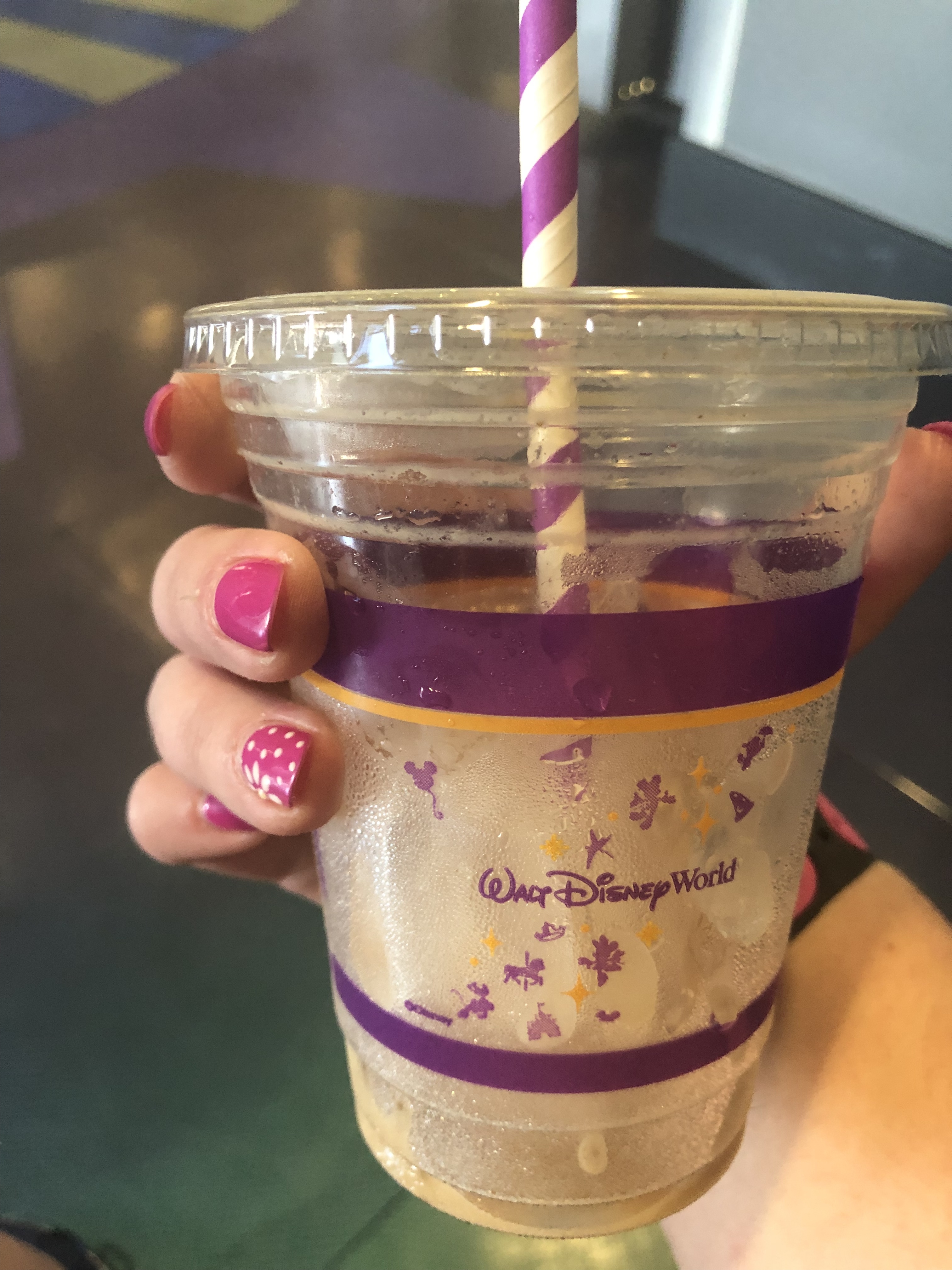 ). We left our room later than planned so it was probably 8:15 when we got to the bus stop and the line for MK was cray. Thankfully buses came one after another so we didn’t have to wait too long, but we did miss the welcome show (and RD!). We got into the park by 9:10 with everyone and their mother! We had FPPs for Splash, BTMRR, and 7DMT so we decided to head to Tomorrowland so DF could ride Space without a ridiculous wait. It wasn’t a walk on since we were behind the RD crowd but it was only like 20 mins and we were in no rush so it was fine. I rode the Peoplemover (one of my favs!) and had an iced chai from Joffrey’s while I waited. The paper straws do disintegrate quickly. But I love the Disney cups!