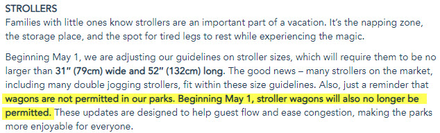 “… I then called Jason Kirk’s office and a very friendly CM told me that stroller wagons are officially not allowed as they are wagons, but unofficially have been allowed for about five years now. They remain conflicted on the stroller wagons - not due to footprint - length and width comparable with strollers. BUT two big issues they are evaluating. First is how much people put in these stroller wagons and have to be searched by security. Some are really abusing this “feature” of stroller wagons. Second is the vertical height with the canopy. When parked in stroller parking, it makes it hard for others to find their “shorter” strollers. It’s like if they allowed motorhomes in the standard parking lots. It would be very hard for people to find their cars behind the motorhome. For this reason, they have not updated their policies to allow stroller wagons. They want the flexibility to limit these in the future. Like all policies, Disney reserves the right to change them at any time. But for now, stroller wagons are unofficially permitted and recent announcements do not change this position.”