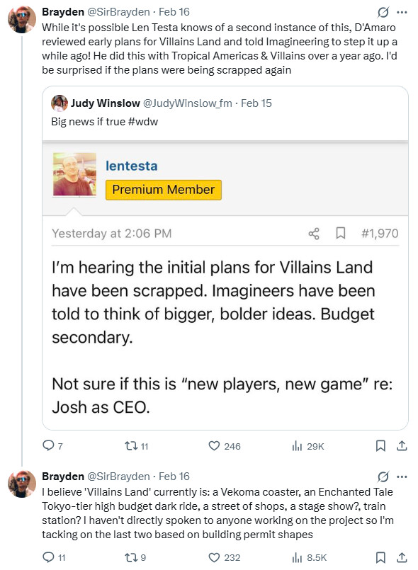 “I’m hearing the initial plans for Villains’ Land have been scrapped. Imagineers have been told to think of bigger, bolder ideas. Budget secondary. Not sure if this is “new players, new game” re: Josh as CEO.”