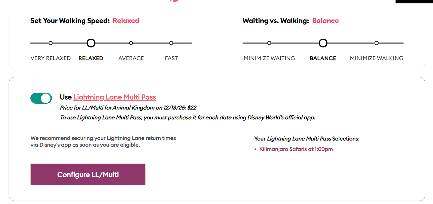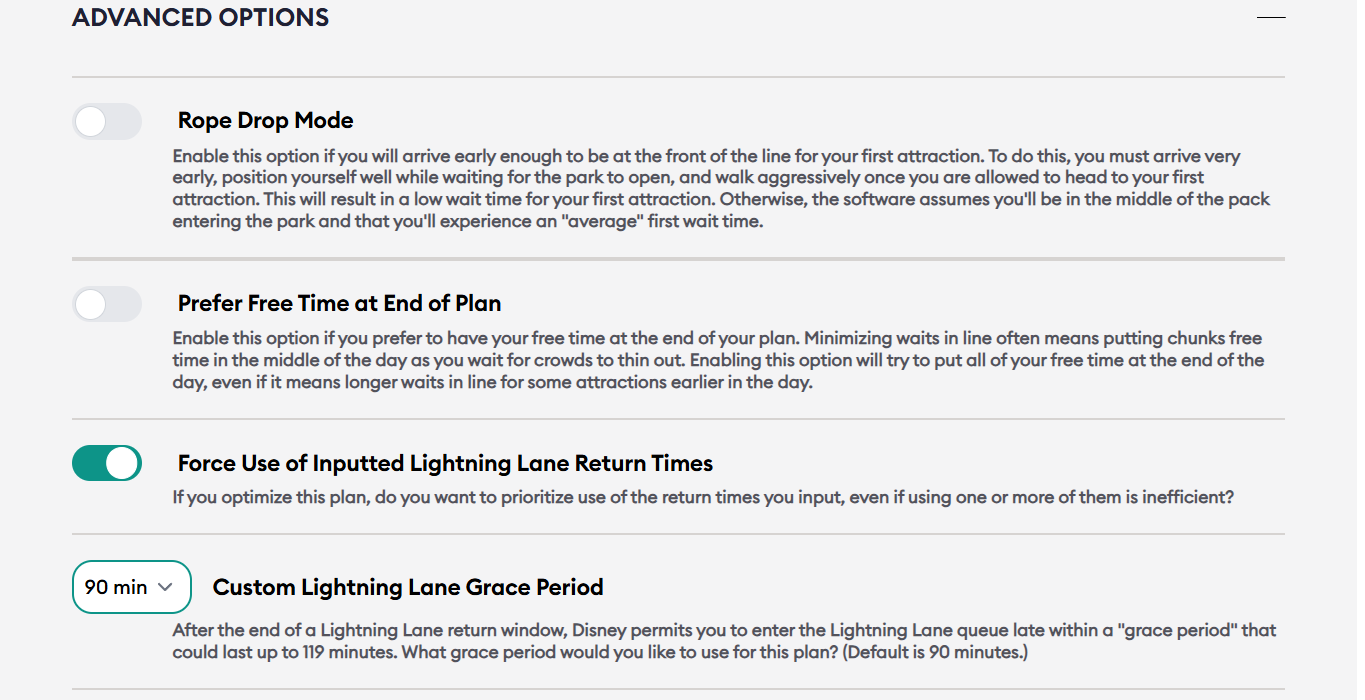 And then toggle ON the “Force Use of Inputted Lightning Lane Return Times”