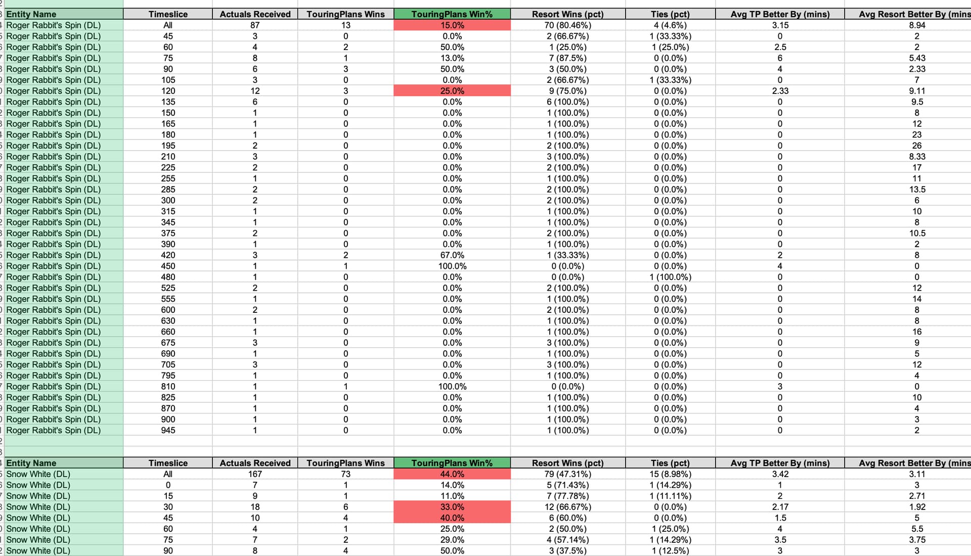 We model around 300 attractions around WDW, DLR, and UOR. Around 200 of them are “core” attractions, like Slinky, Pirates, etc., with posted wait times that vary significantly.