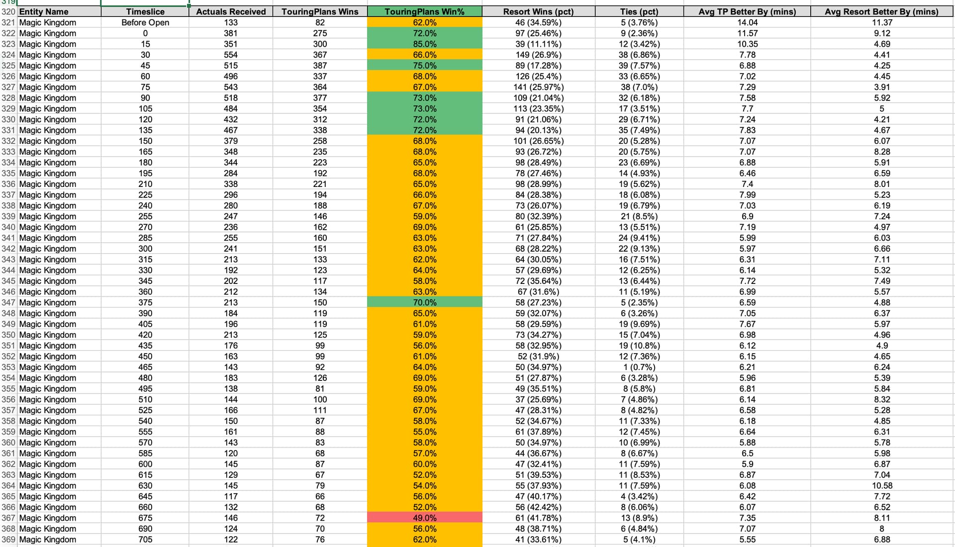 Each of those 200 attractions starts the day with anywhere from ~60 to ~80 wait-time predictions (we include a bit of time before and after official park opening, in case Disney changes park hours during the day itself).