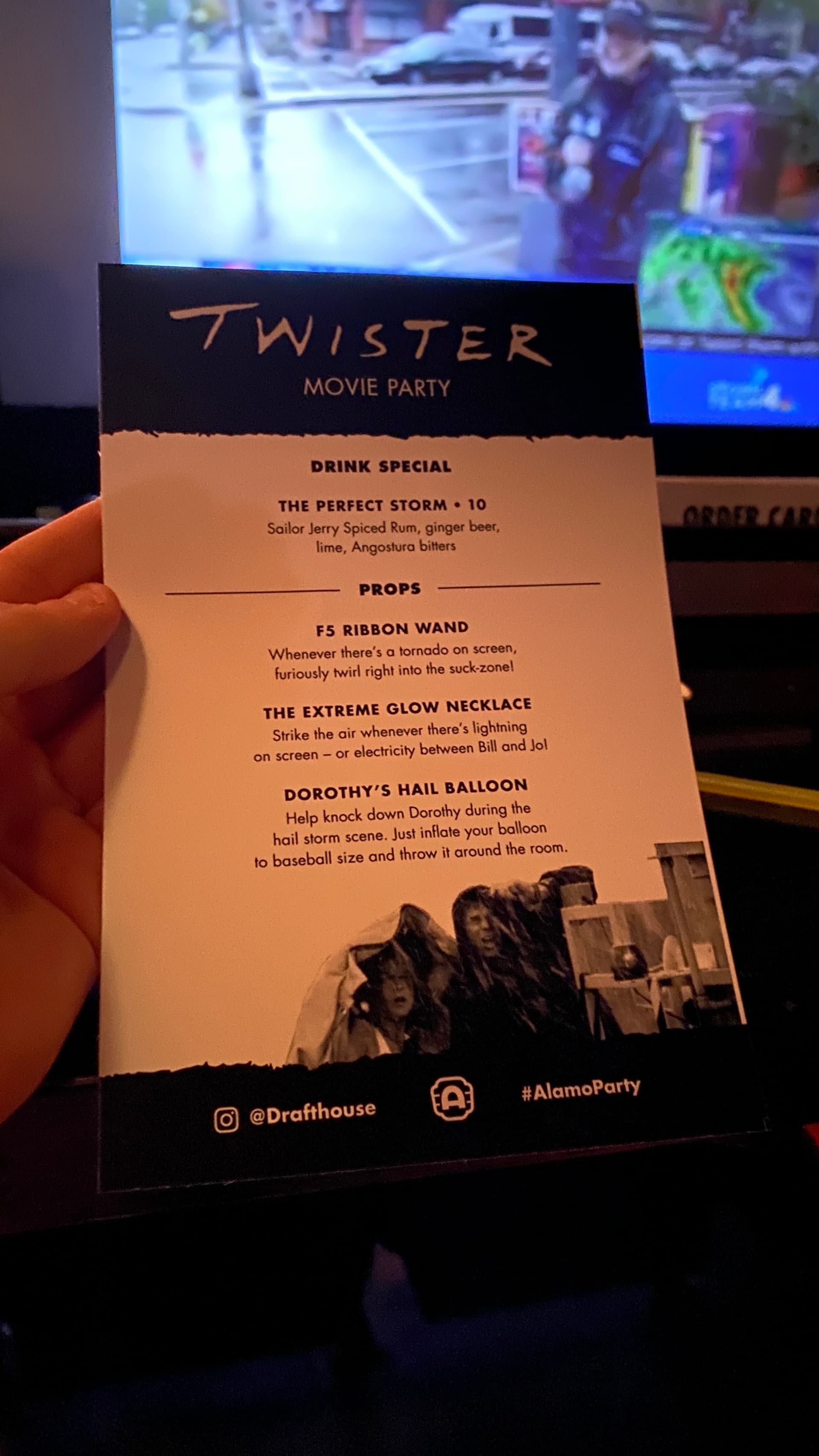 There is a local movie theater (Alamo Drafthouse) that does “movie parties” where they show old movies and give you props to encourage audience participation. Always a blast. They’ve done Twister a few times. So much fun!