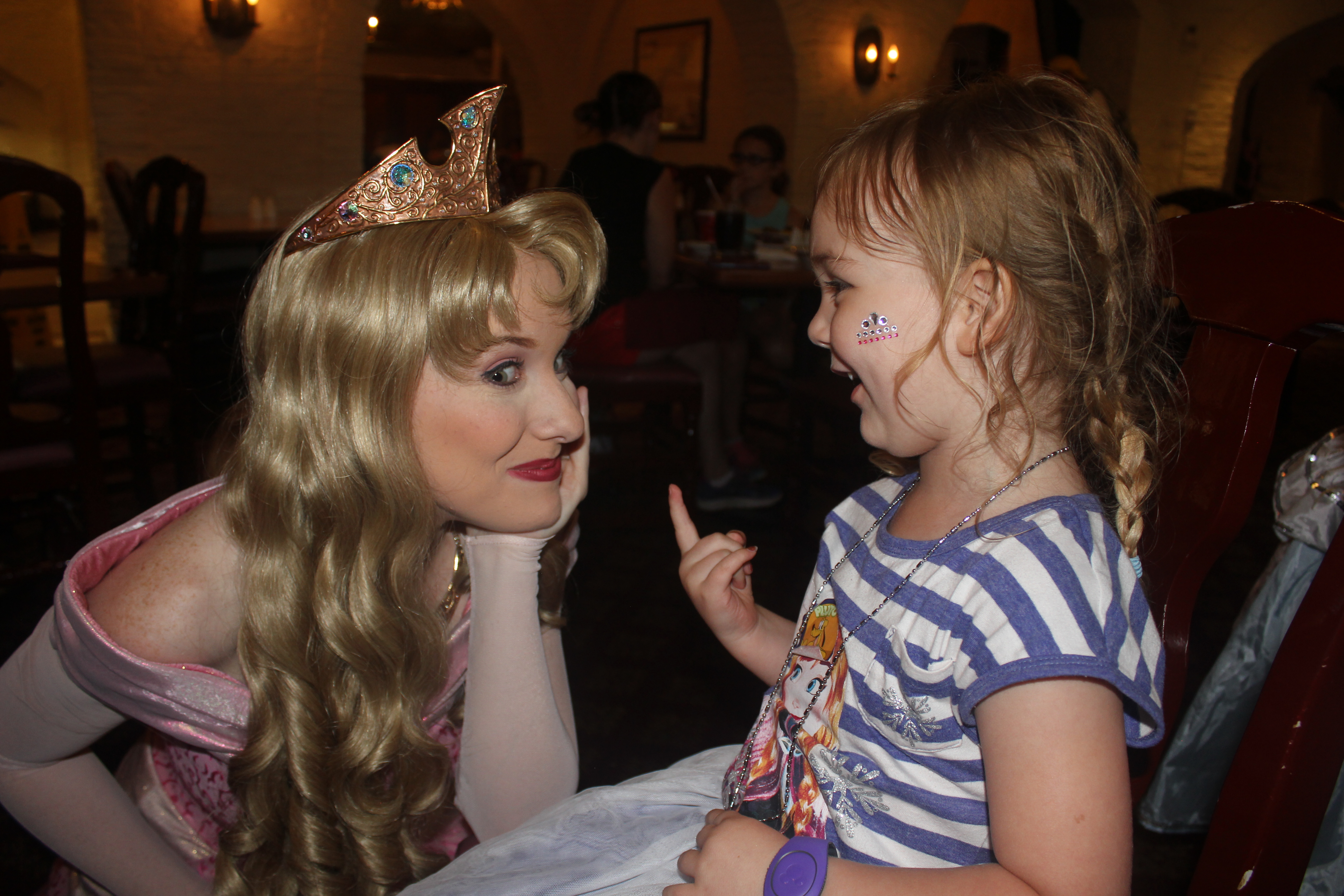 Ariel was up next, she was spunky and spot on. DD3 spent most of the time telling her everything she knew about mummies and Egypt. Egypt is DD3’s pet subject, and she loves getting books on it at the library. Ariel was still at our table when Aurora showed up. Ariel told DD3 that she would be ruling kingdoms when she was older since she already knew so much about the world. DD3 ate it up.