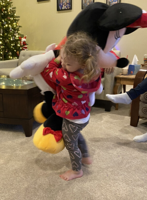 Here’s my great granddaughter with the giant Minnie we sent her for Christmas. She LOVES everything Minnie Mouse